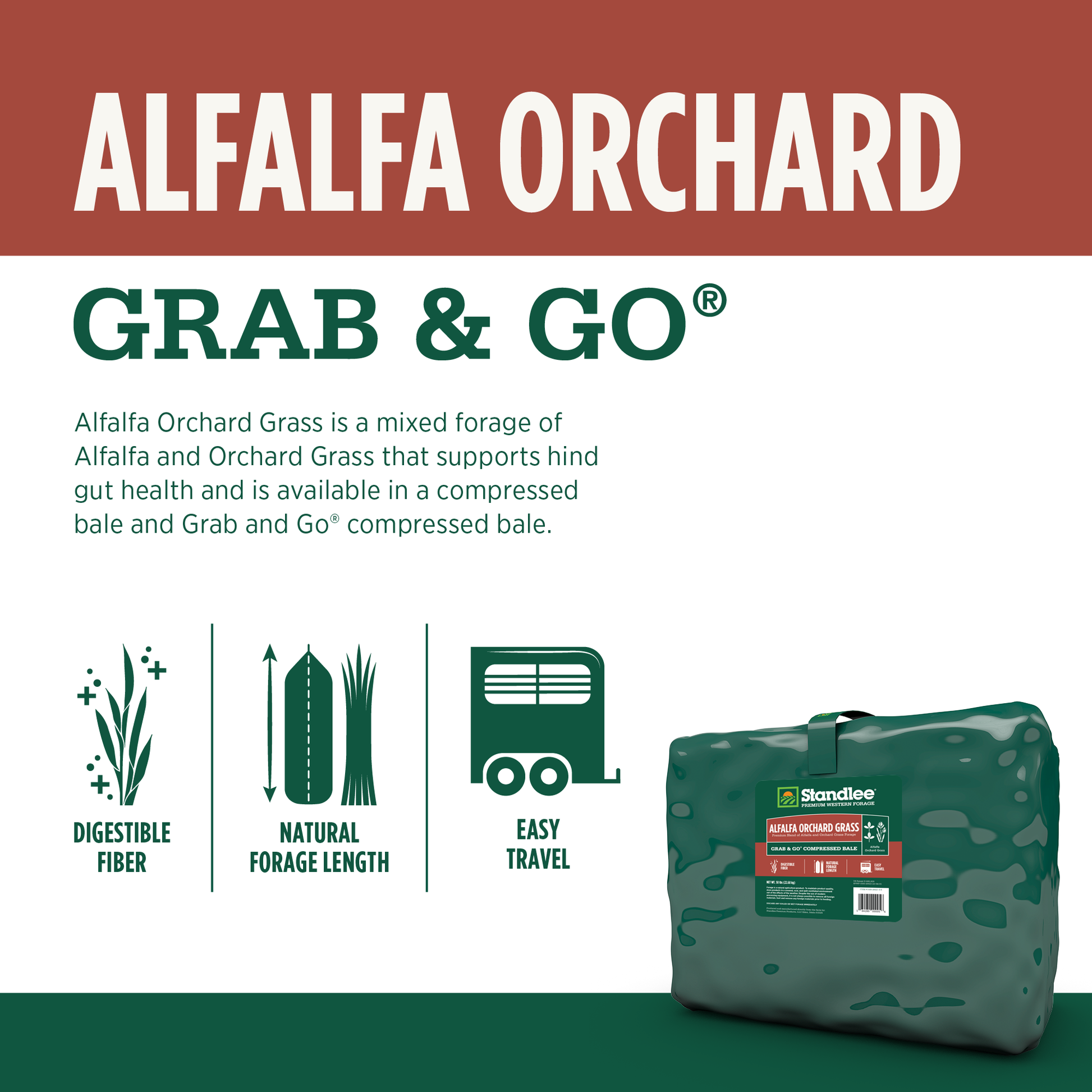 Premium Alfalfa/Orchard Grass Grab & Go Compressed Bales are formed by allowing Standlee Premium Western Forage to grow to the proper stage of maturity, cutting the plants, allowing them to sun-cure (dry) to an acceptable moisture level and baling the forage at the optimal time. Standlee Premium Western Forage creates Grab & Go compressed bales of forage from a large 4’x4’x8’ bale that is put through a press, sliced horizontally, pushed onto a scale, weighed, compressed, banded and then shrink-wrapped. This combination of Alfalfa and Orchard Grass is moderate in protein and moderate to low in sugar and is very palatable. Forages are non-perishable and can last for long periods of time if stored properly. Always store forages in a cool, dry and well-ventilated area.