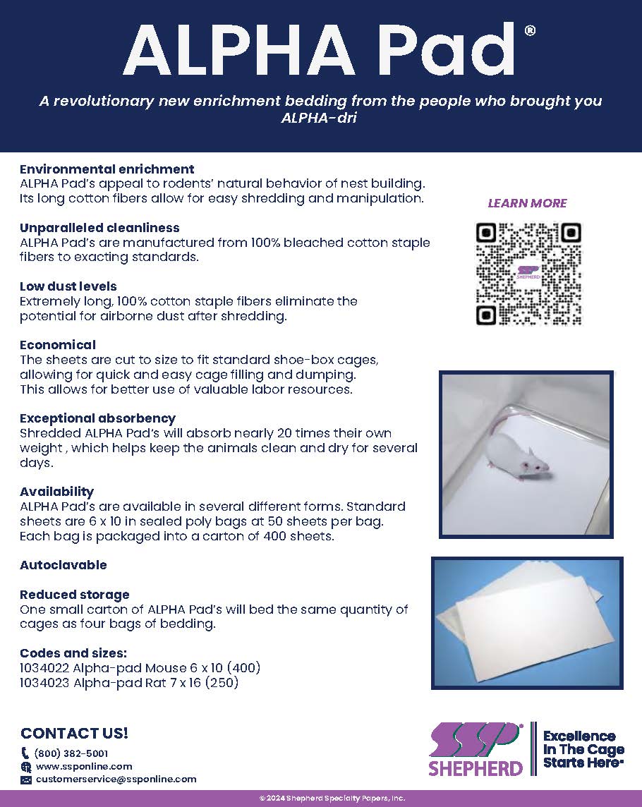 A revolutionary new enrichment bedding from the people who brought you ALPHA-dri®. ALPHA Pad appeals to rodents' natural behavior of nest building. Its long cotton fibers allow for easy shredding and manipulation. ALPHA Pad is manufactured from 100% bleached cotton staple fibers to exacting standards. It is extremely long, which eliminates the potential for airborne dust after shredding.