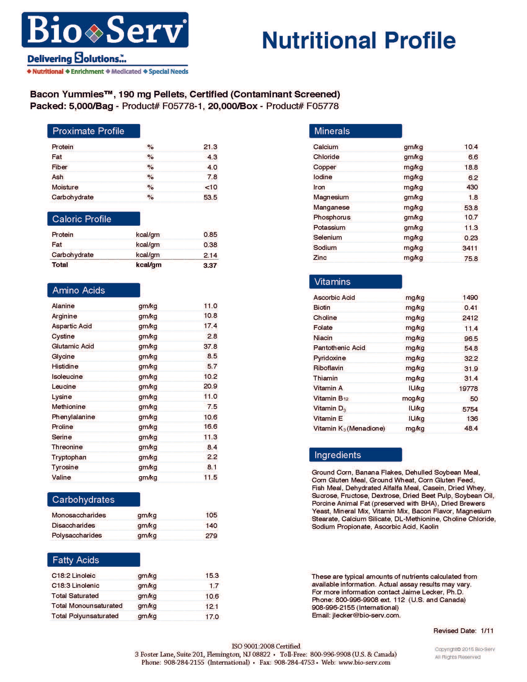 Ground Corn, Banana Flakes, Dehulled Soybean Meal, Corn Gluten Meal, Ground Wheat, Corn Gluten Feed, Fish Meal, Dehydrated Alfalfa Meal, Casein, Dried Whey, Sucrose, Fructose, Dextrose, Dried Beet Pulp, Soybean Oil, Porcine Animal Fat (preserved with BHA), Dried Brewers Yeast, Mineral Mix, Vitamin Mix, Bacon Flavor, Magnesium Stearate, Calcium Silicate, DL-Methionine, Choline Chloride, Sodium Propionate, Ascorbic Acid, Kaolin