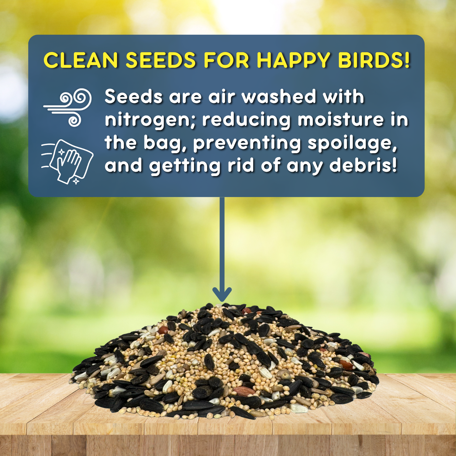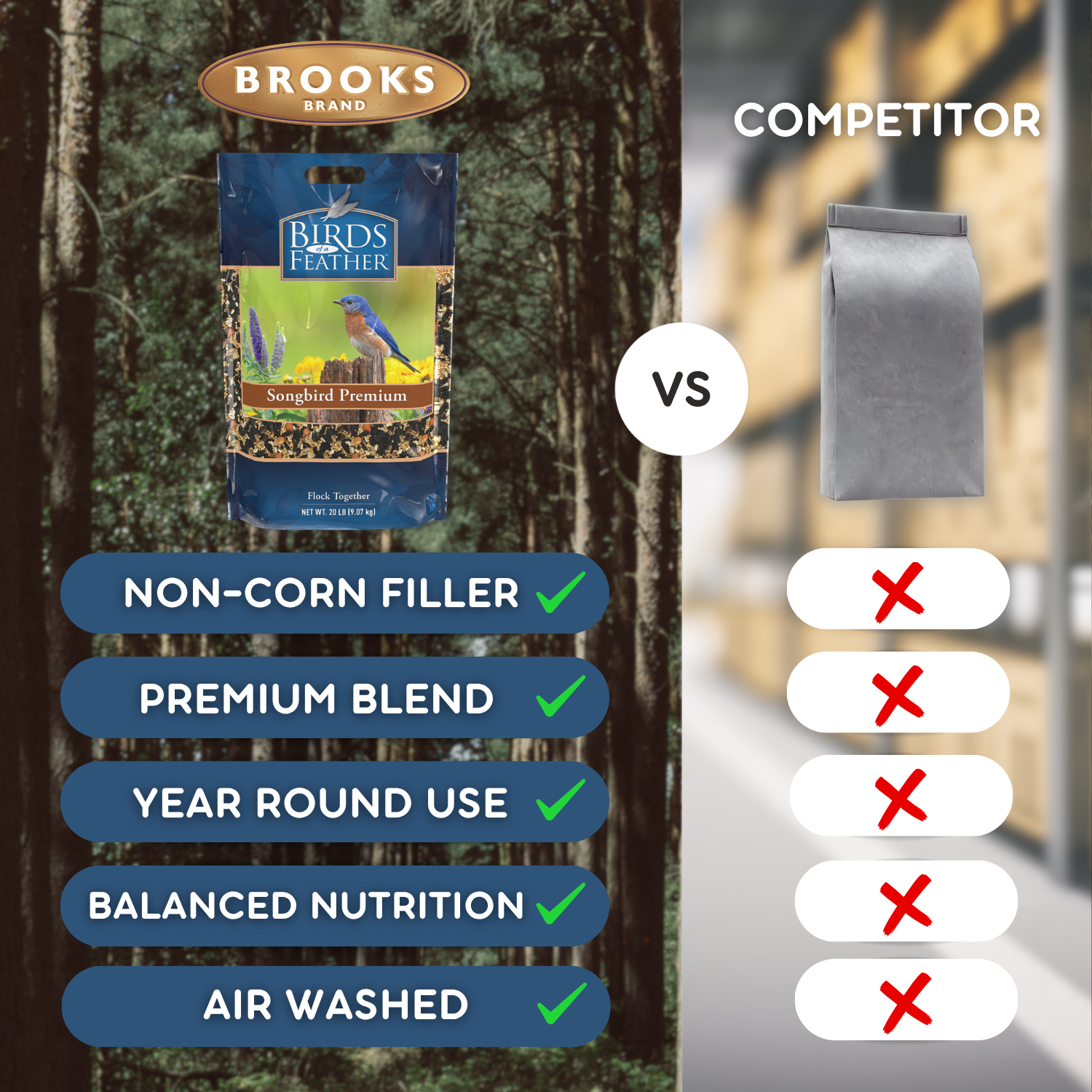 Birds of a Feather Songbird Premium is a high-quality wild bird seed blend designed to attract songbirds and other small backyard visitors. Featuring black oil sunflower, white proso millet, safflower, sunflower chips, and peanut pickouts, this mix offers the protein and fat wild birds need to thrive. Ideal for year-round feeding in southern and midwestern regions, it’s perfect for finches, chickadees, titmice, and more. This blend must be used with tray, platform, or tube feeders only. It is not compatible with hopper or enclosed feeders due to seed texture and size. Enjoy peaceful, colorful birdwatching right outside your door with this premium, USA-made formula.