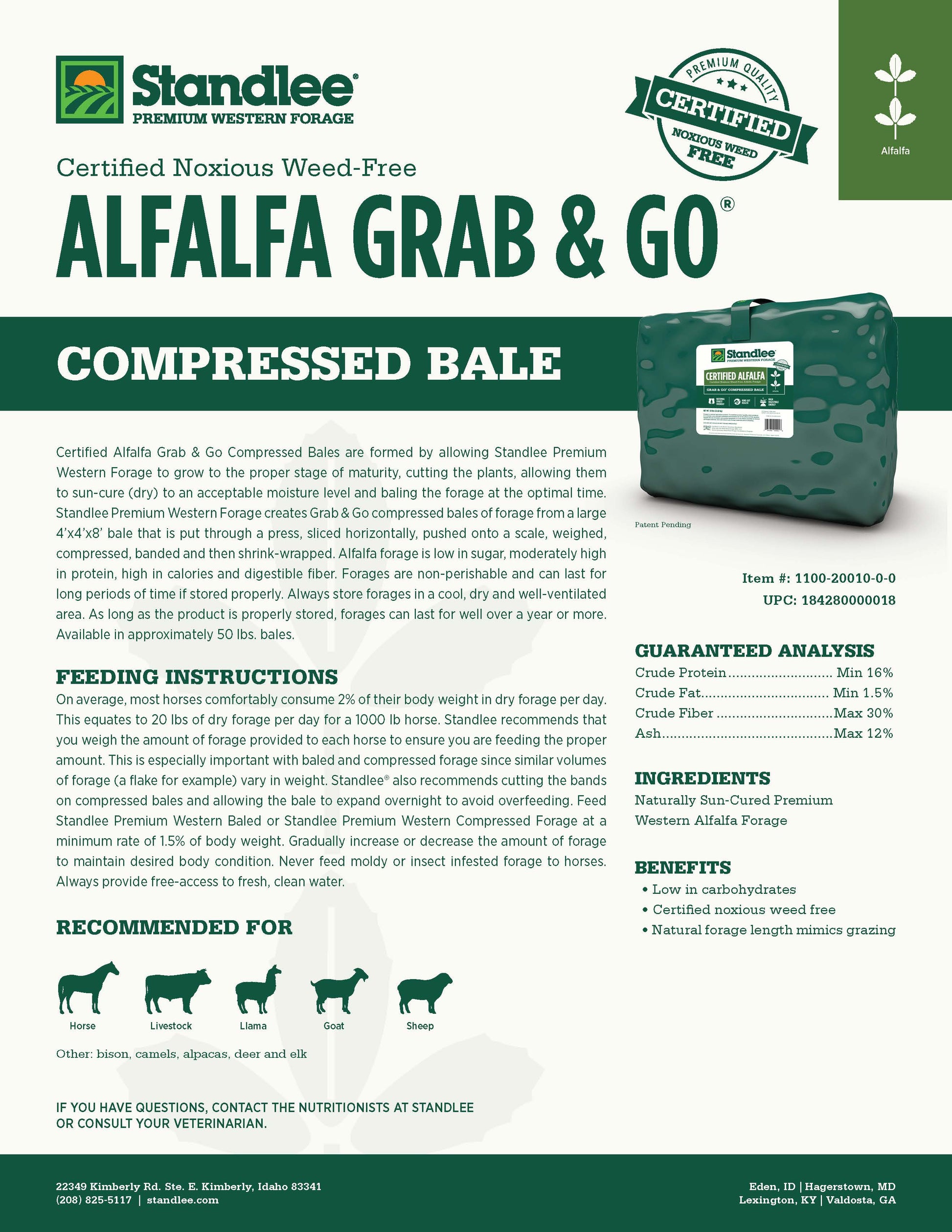 Standlee Premium Western Forage Certified Alfalfa Grab & Go Compressed Bales are made from compressed high-quality sun-cured forage and shrink-wrapped, making them easier to handle and store. Standlee Alfalfa noxious weed free hay bales are low in sugar, moderately high in protein, high in calories and digestible fiber to promote hind gut health, while being forest friendly.