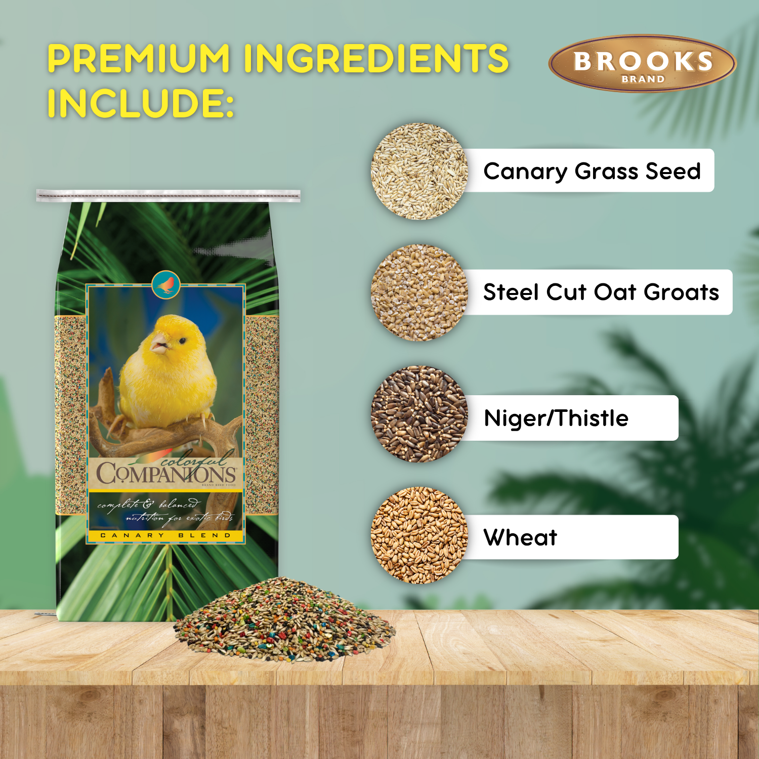 Colorful Companions Canary Blend is a premium, nutritionally complete food crafted to meet the dietary needs of canaries. This carefully selected mix of high-quality, triple-cleaned seeds, grains, and vitamin-enriched pellets offers optimal nutrition in every bite. The added feather conditioners help promote bright, strong plumage, while the diverse textures and ingredients keep birds engaged and satisfied. Each component is sized specifically for canaries to encourage natural foraging and reduce waste. Whether for everyday feeding or during active periods, this blend delivers consistent quality and health benefits.