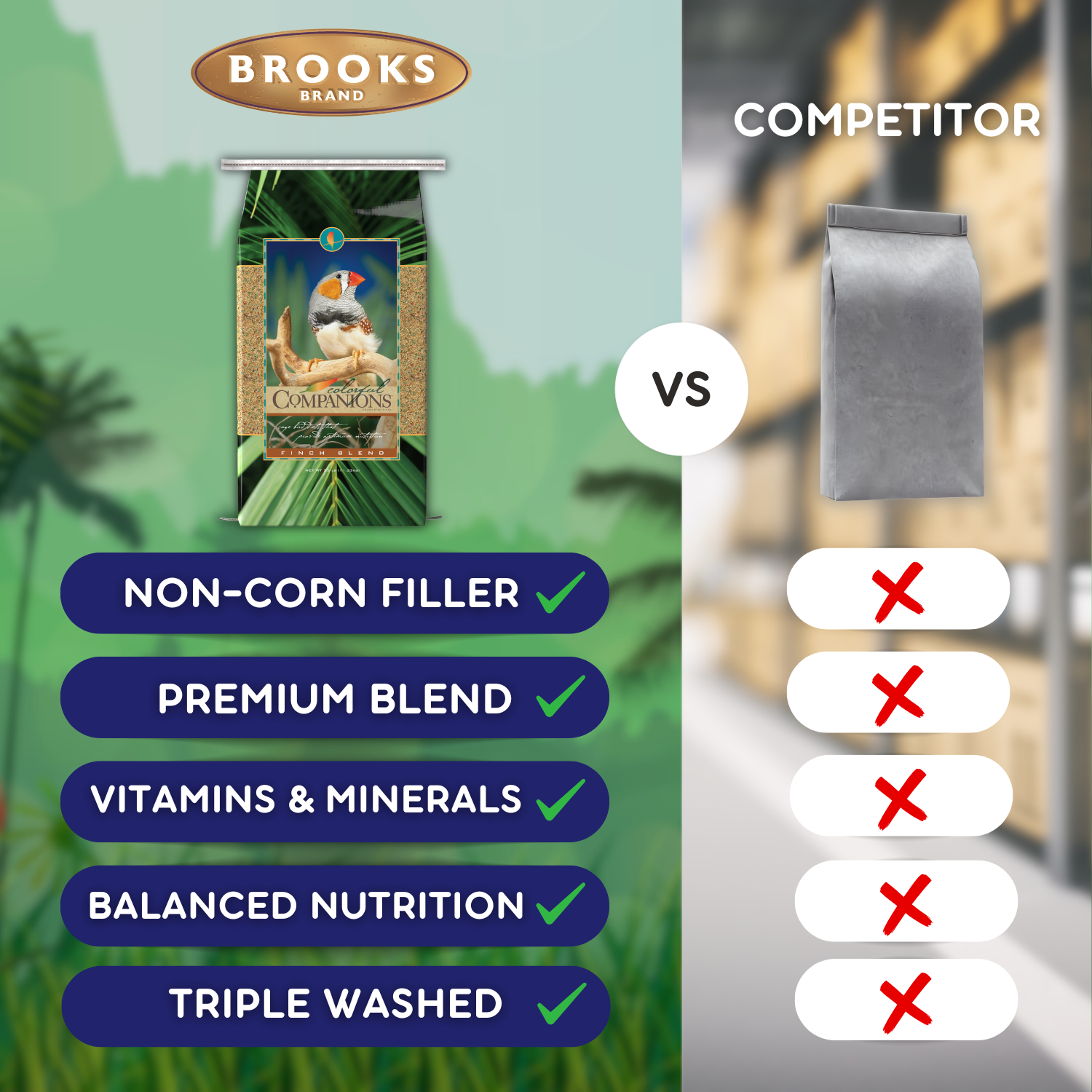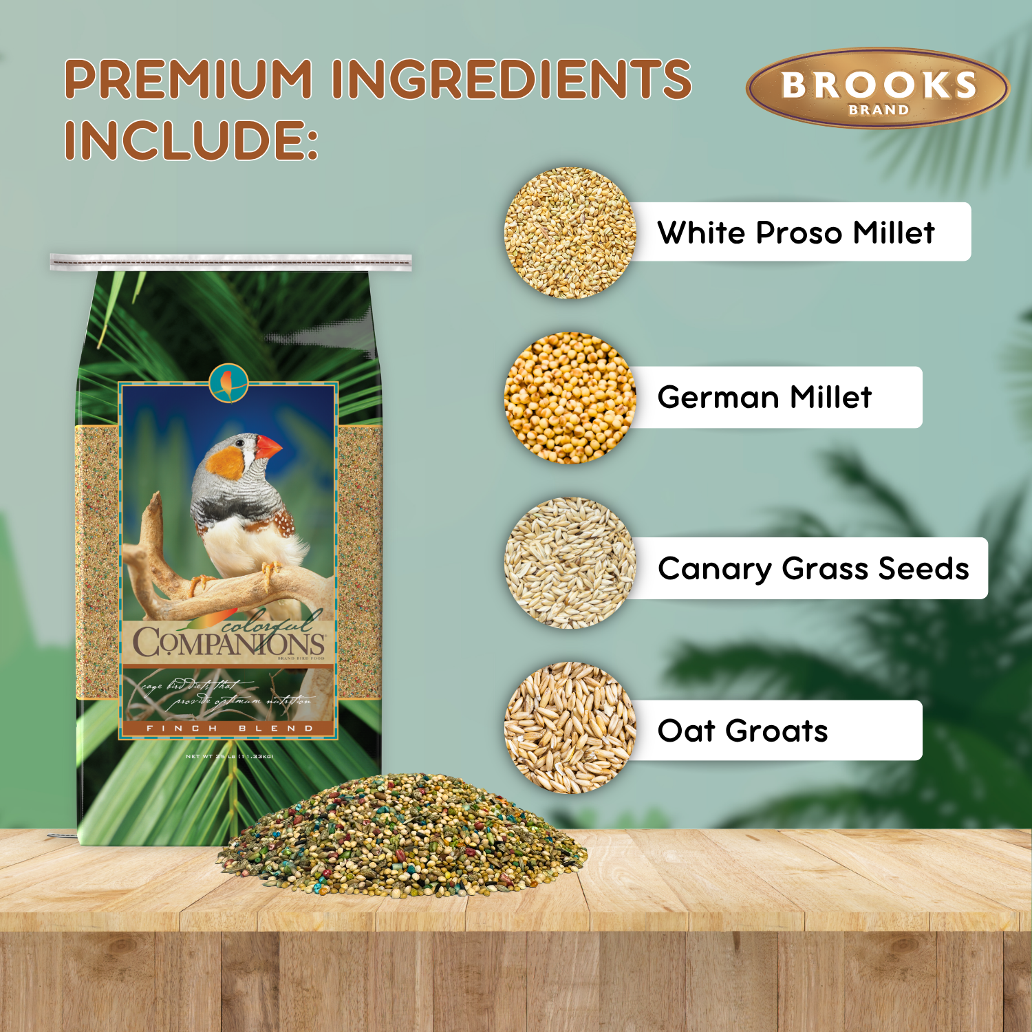 Give your feathered friends the best with Colorful Companions Finch Blend. This finch bird food is specially crafted with appropriately sized seeds, grains, and nyjer seed for finches, triple cleaned for purity and freshness. The mix includes nutrient-enriched pellets with added vitamins, minerals, and feather conditioners to promote strong, colorful plumage. Ideal as finch food for outside feeders or for indoor aviaries, this highly palatable blend supports the dietary needs of goldfinches, house finches, and other small birds. Whether you're looking for finch seed, wild finch food, or thistle seed for birds, this 25 lb bag delivers premium nutrition in every bite.