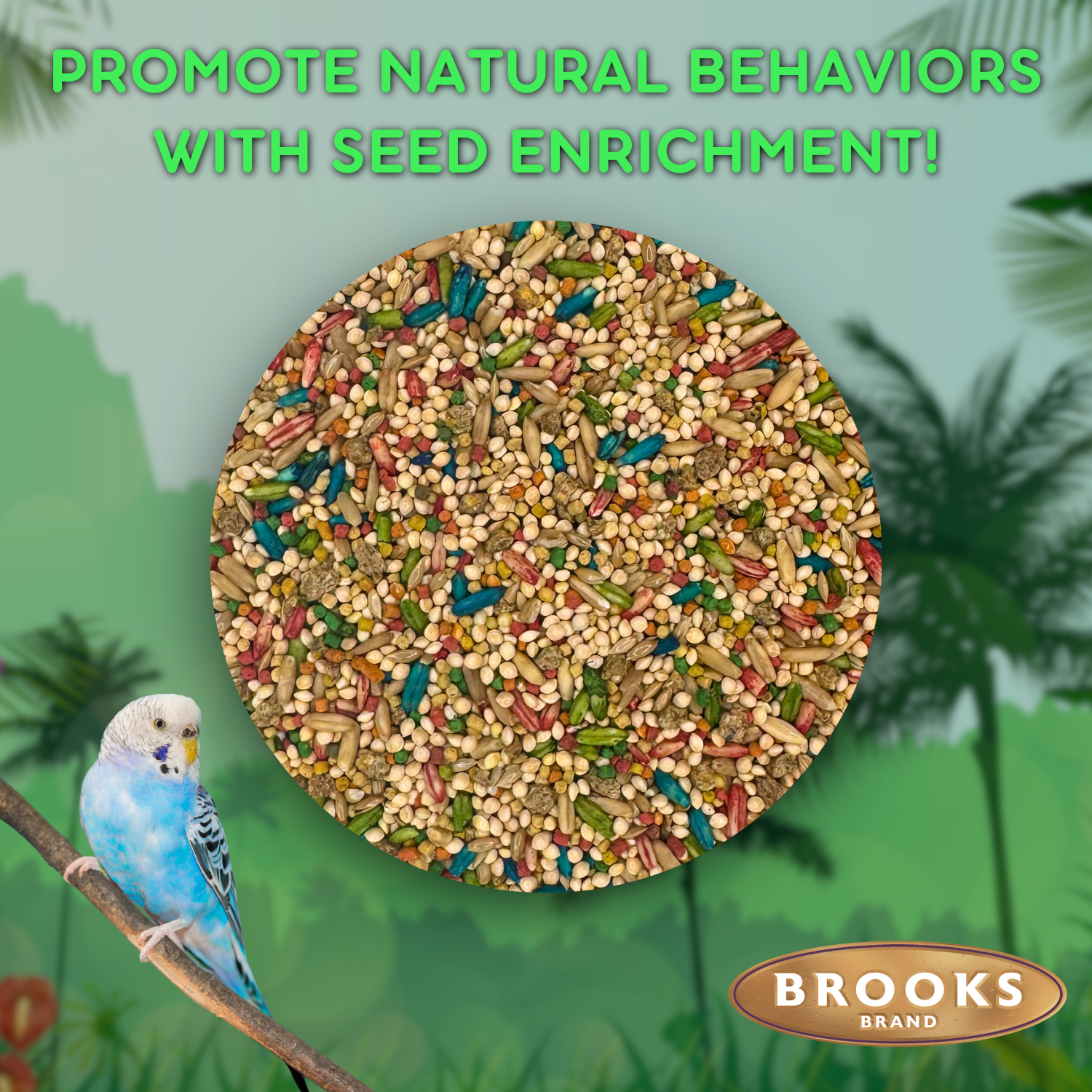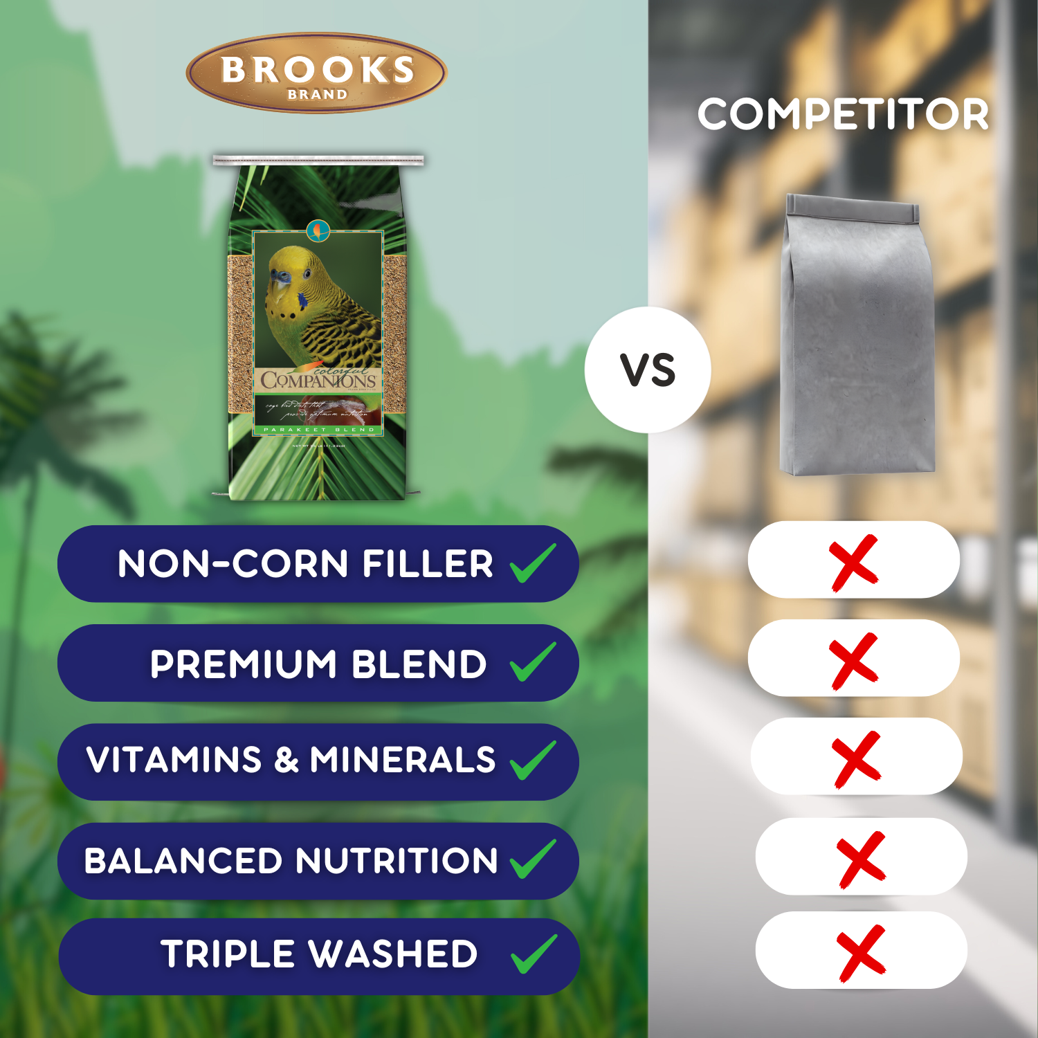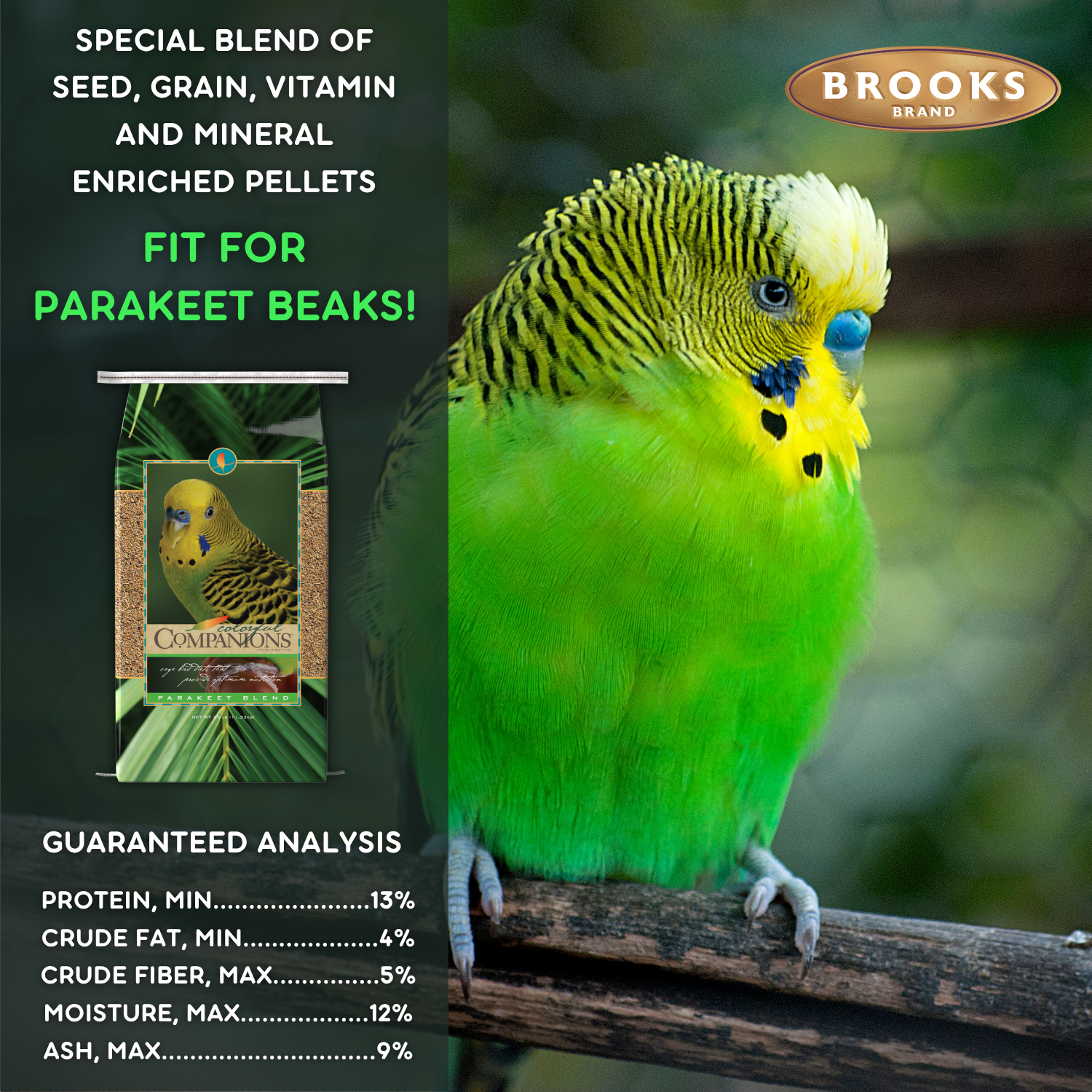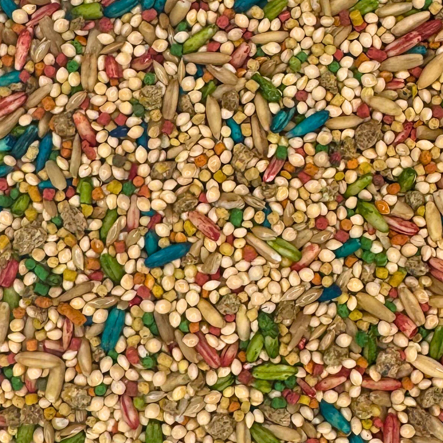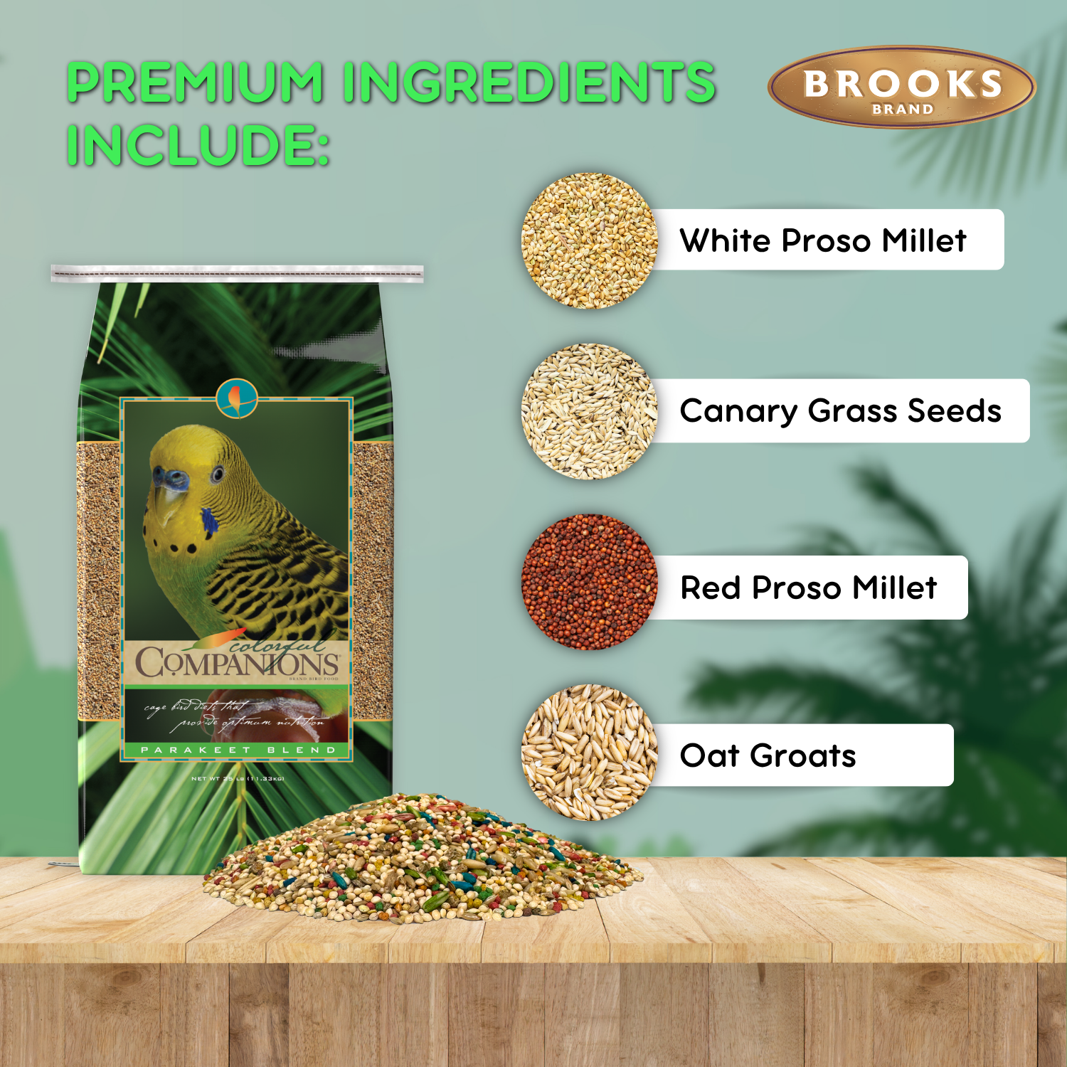 Colorful Companions Parakeet Blend is a nutritionally complete bird food for parakeets, budgies, and lovebirds. This 25 lb mix features a colorful, appetizing variety of triple-cleaned seeds, grains, peanuts, and vitamin-rich extruded pellets. Designed to support healthy plumage, digestion, and energy, it replaces the need for less nutritious fillers like lime and sand. The appropriately sized ingredients encourage natural foraging and provide complete, balanced daily nutrition. Whether you're shopping for parakeet food, budgie pellets, or comida para periquitos australianos, this blend is a flavorful, healthy choice for your feathered companion.