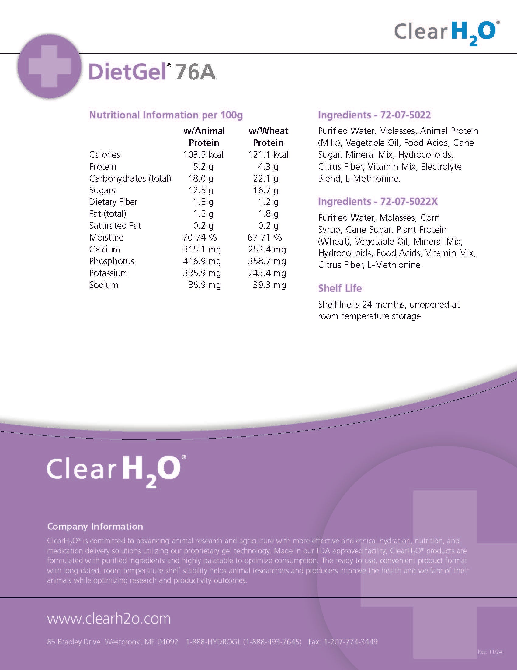 DietGel 76A is a nutritionally fortified dietary supplement, combining hydration and nutrition in a single serving. Formulated with purified ingredients, modeled on the AIN 76A maintenance diet formulation. It is flavor enhanced resulting in increased consumption.