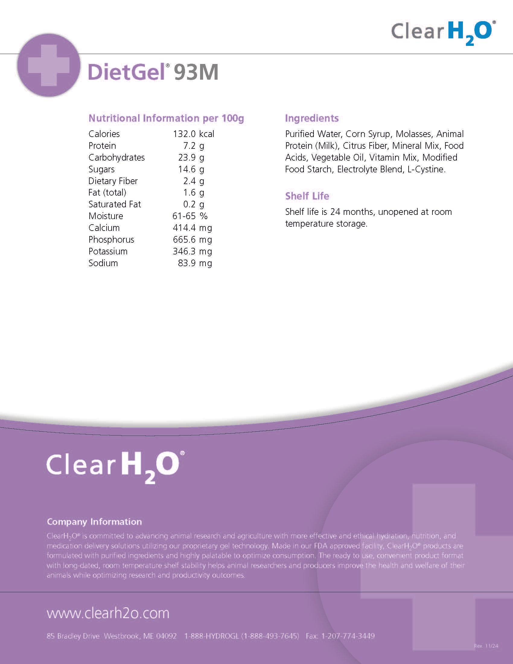 DietGel 93M is a complete maintenance diet containing a full spectrum of vitamins and minerals. Formulated with purified ingredients and modeled on the AIN 93M diet, it is flavor enhanced to promote consumption.