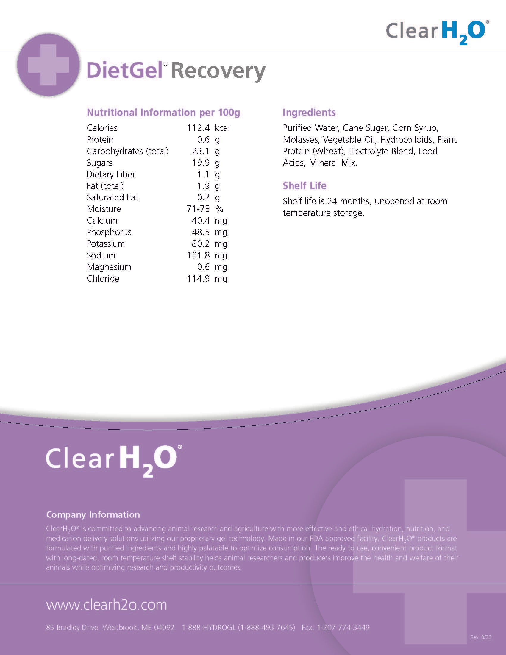 DietGel Recovery is a nutritionally fortified water gel that aids in the recovery of post surgical, weak or impaired rodents. Proven to increase survival rates in compromised animals. Formulated with purified ingredients that provide 70% water, calories and electrolytes.