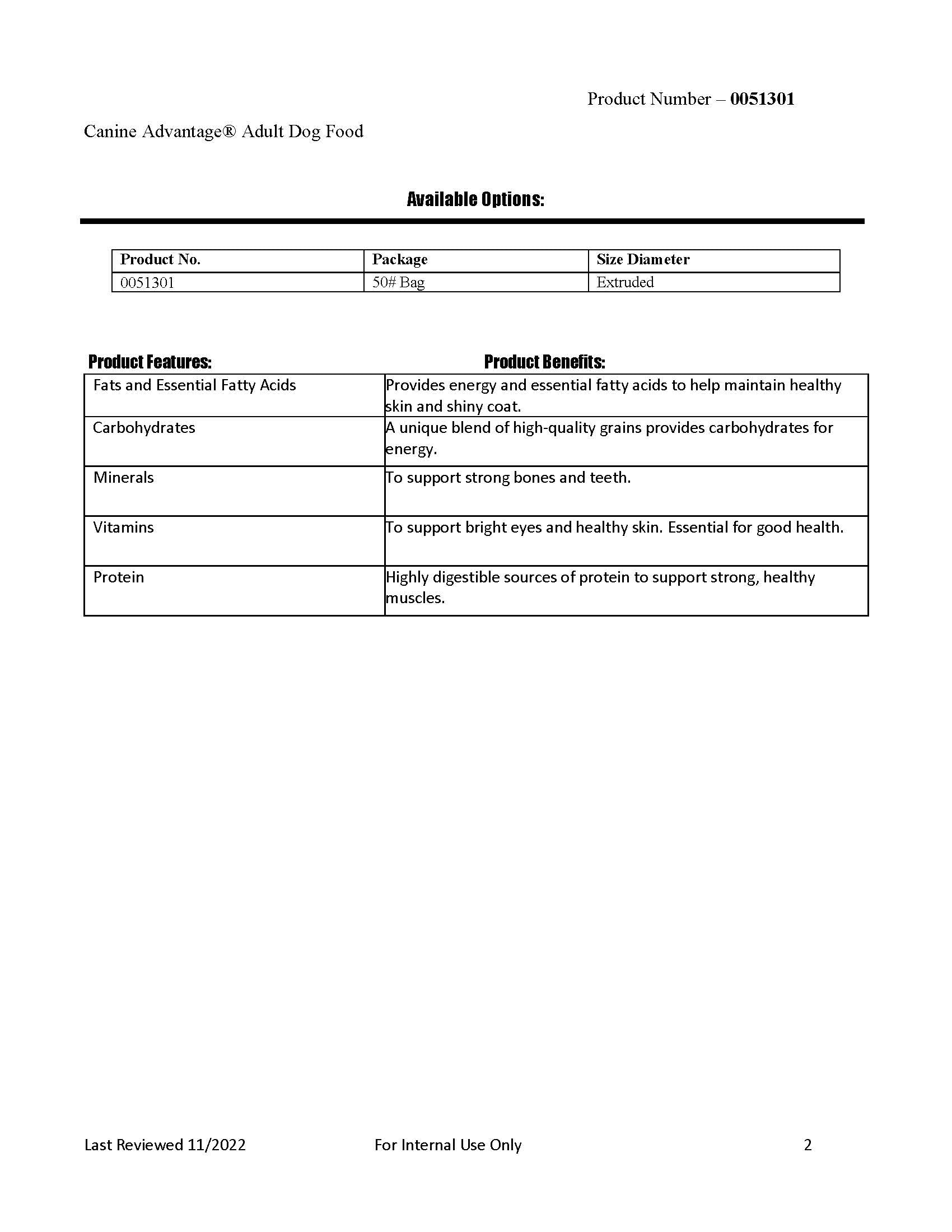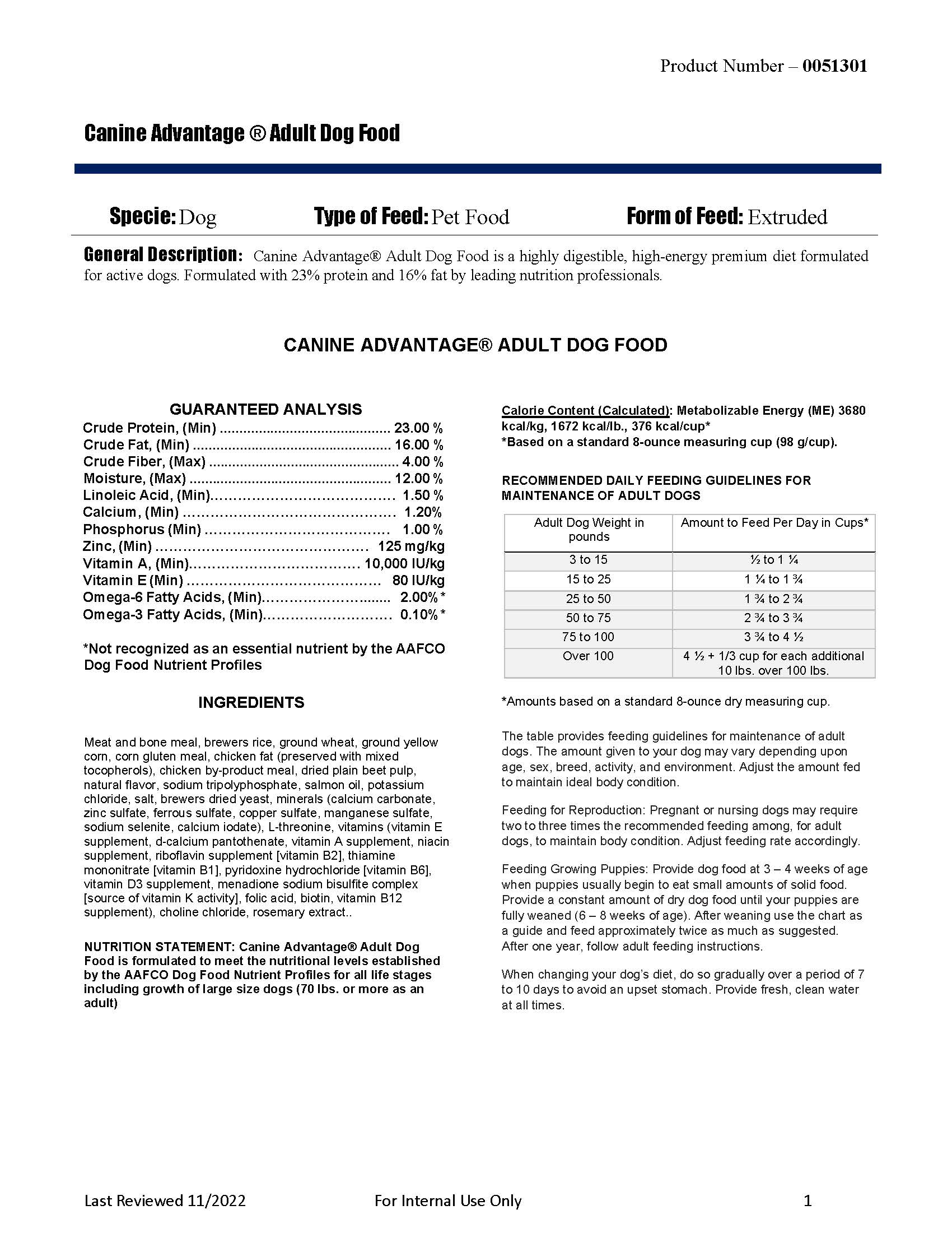Canine Advantage® Adult Dog Food is a highly digestible, high-energy premium diet formulated for active dogs.  Formulated with 23% protein and 16% fat by leading nutrition professionals.