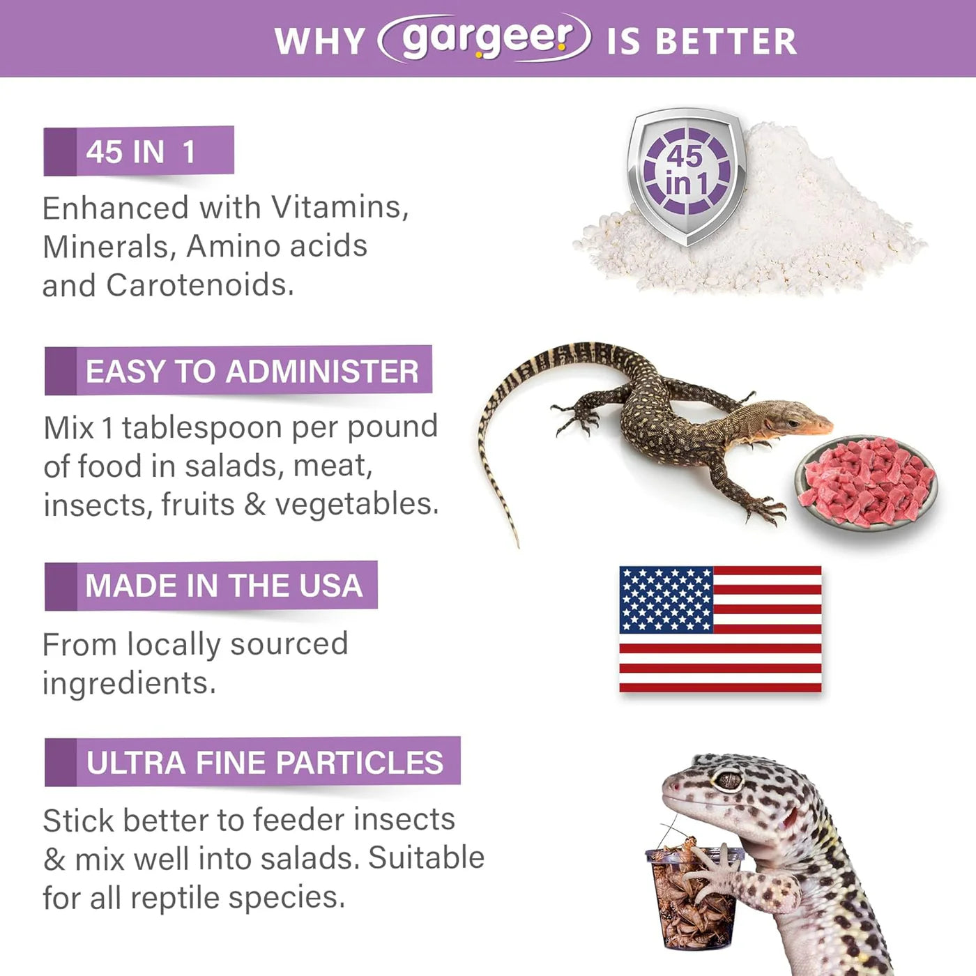 Help you reptiles and amphibians maintain high level of physiological nerve functions, enzyme activities, and electrolyte balance with the help of greatly needed minerals like Potassium, Sodium, Magnesium, Iron, Zinc, Manganese, and Copper. Indoor reptiles may require supplementation since their diet might lack certain minerals found in their natural habitat.