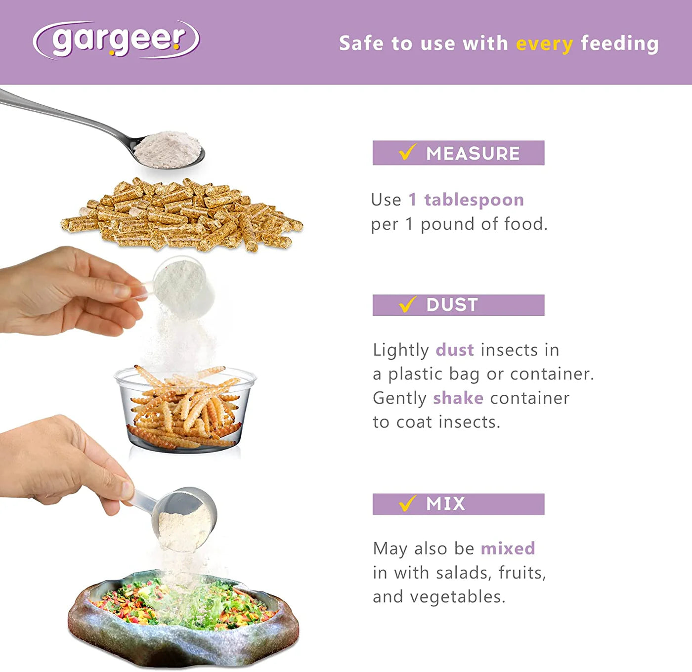 Most live feeder insects for reptiles are naturally low in calcium and require dusting with calcium powder to be nutritionally adequate. Gargeer’s formula is safe to use with every feeding, without the risk of hypercalcemia.