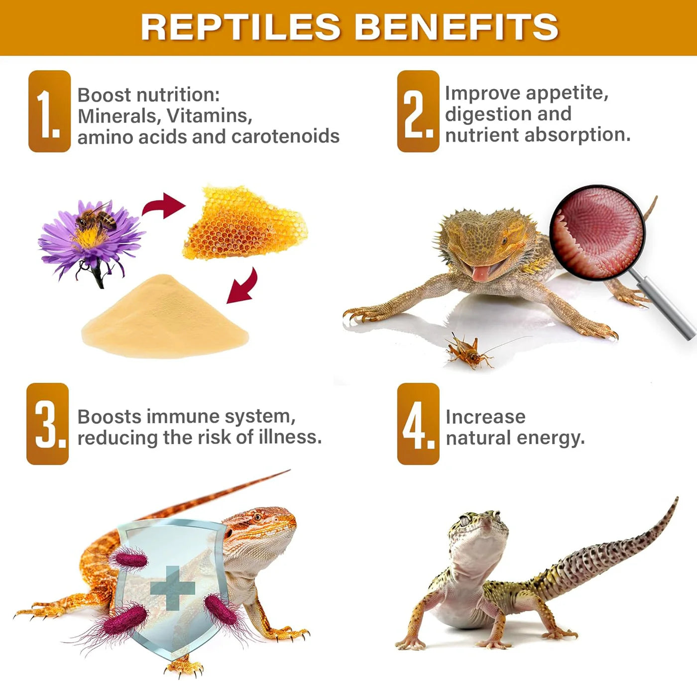 Bee pollen can be beneficial for many species of reptiles, including but not limited to turtles and tortoises, lizards, and geckos! Bearded dragons, crested geckos, blue tongued skinks, and tegus are only a few reptile species that seem to enjoy bee pollen in their diet.