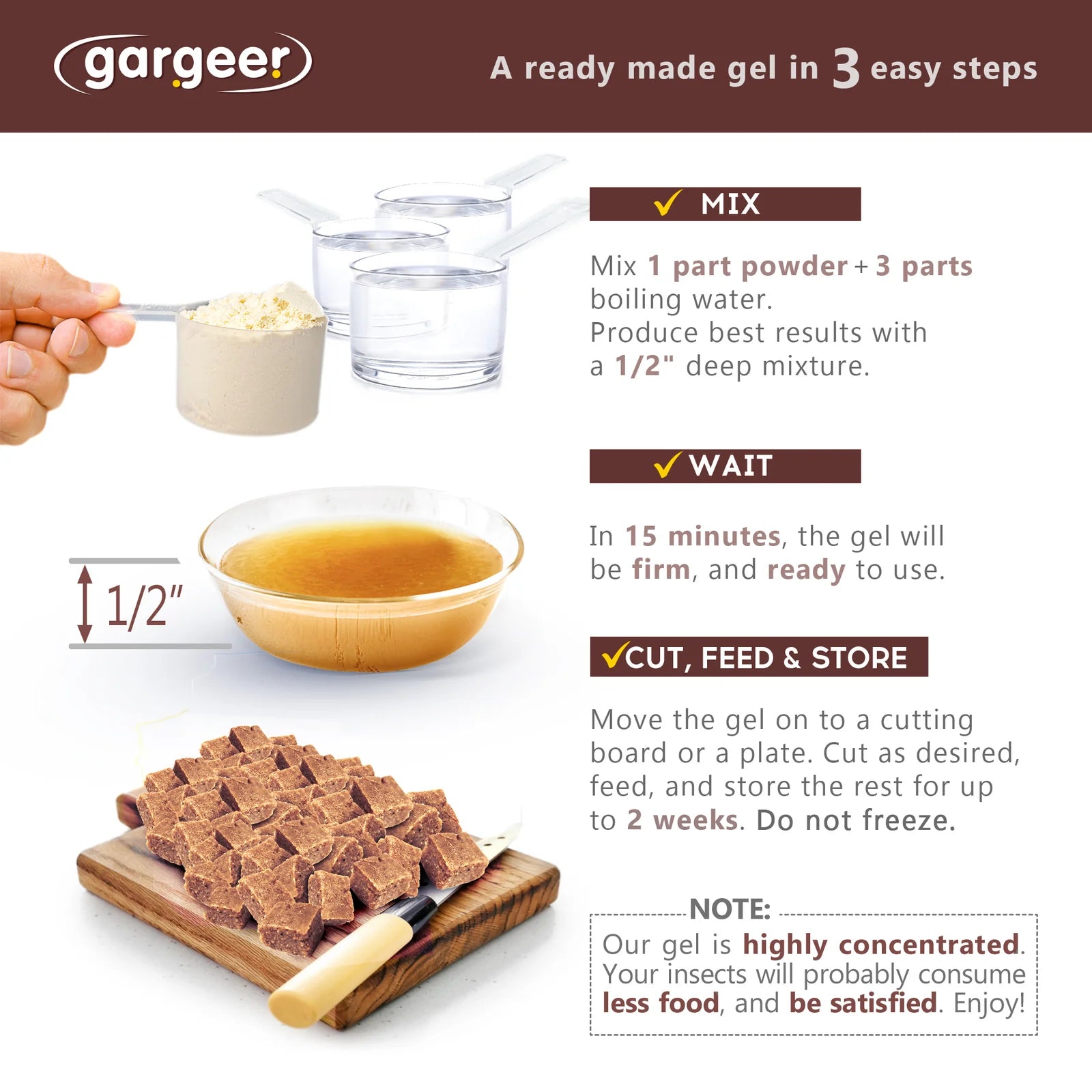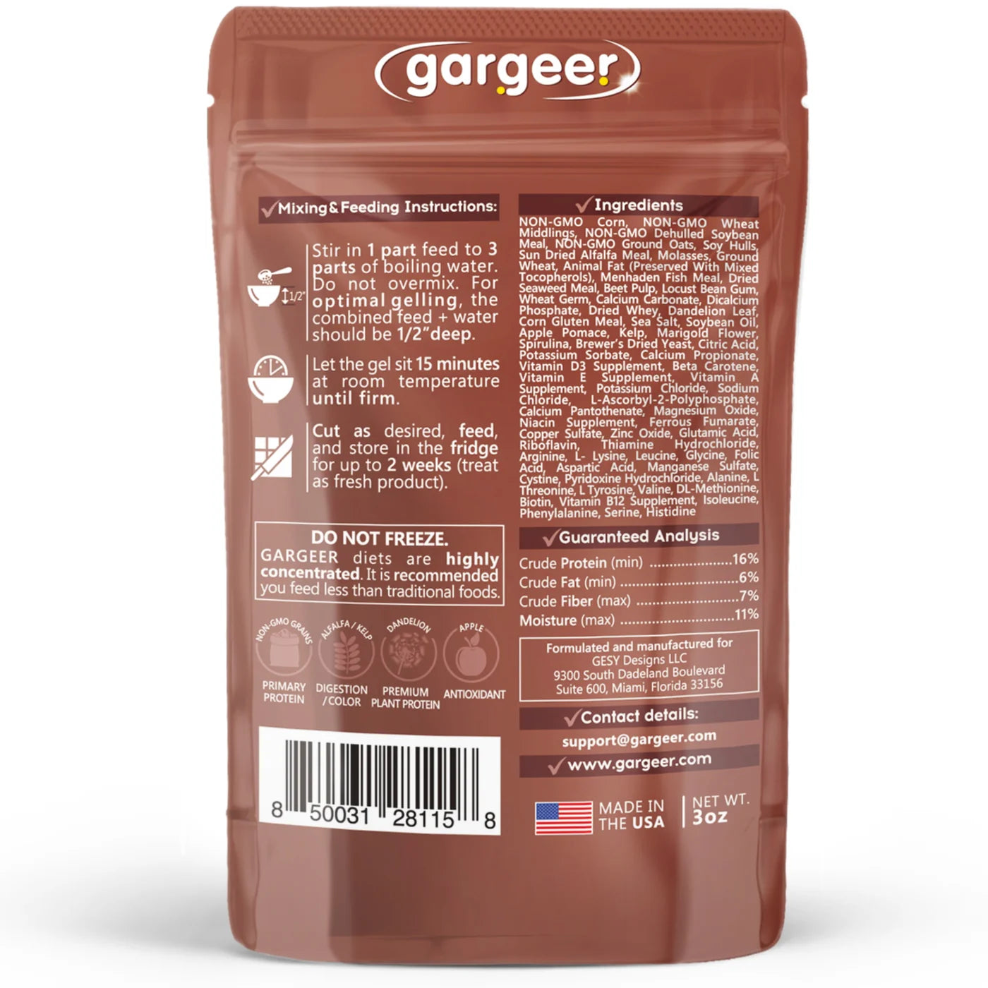 Gargeer gels are complex nutritional formula that come as a concentrated powder, and gel when you add boiling water. You can now prepare a moist food for your pet that is superior to any dehydrated flakes or pellets. 3 oz of powder makes roughly 1 pound of ready to use product.