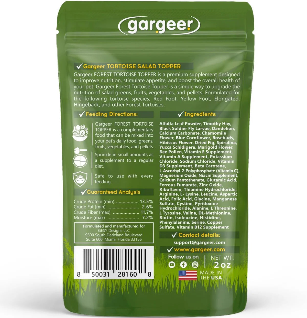 Premium scientifically formulated topper meticulously designed to improve nutrition, stimulate appetite, and boost overall health for Red Foot, Yellow Foot, Elongated, Hingeback, and other Forest Tortoise species. Packed with the finest ingredients like Alfalfa Leaf Powder, Timothy Hay, Black Soldier Fly Larvae, and more. Provides essential nutrients for optimal health and well-being.