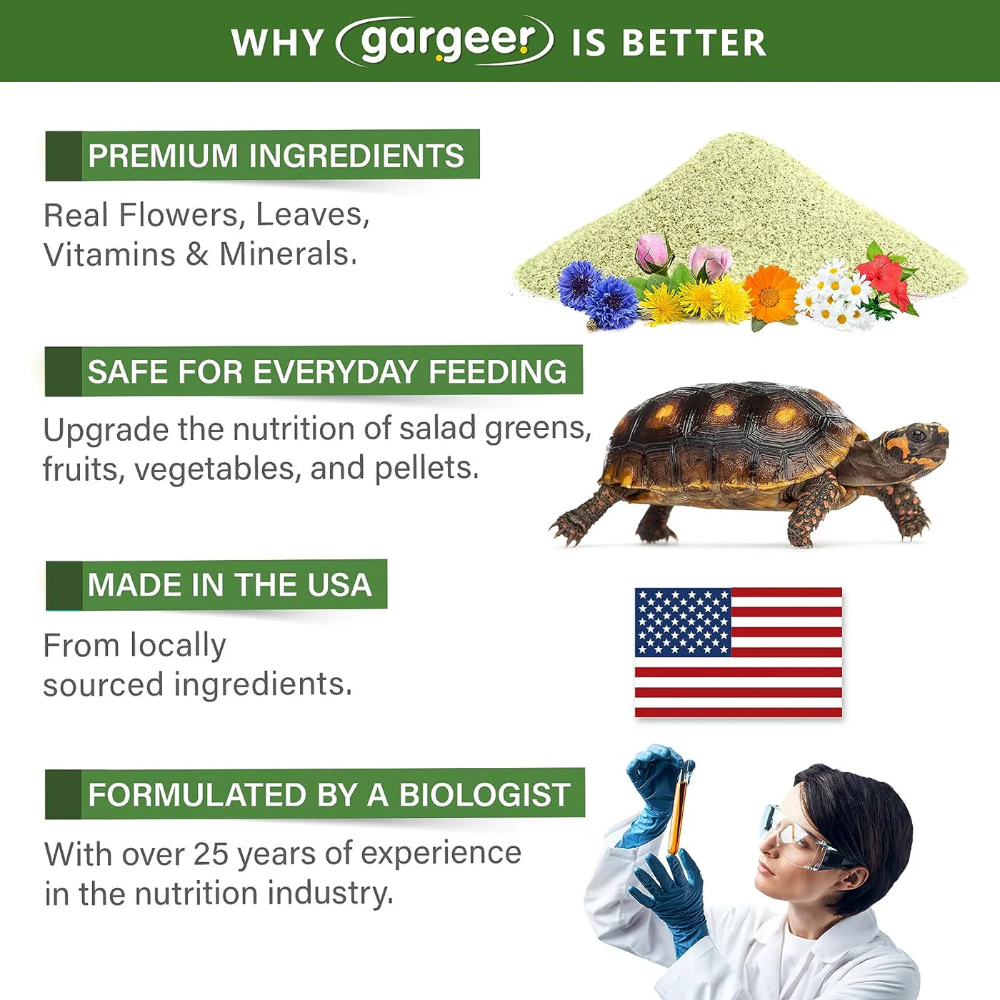 Upgrade the nutrition of your tortoise's meals effortlessly. Our topper is a "Must-Have" and a simple way to improve their diet, making it easy to provide your pet with a balanced and flavorful feast. It easily integrates into their daily food, including greens, fruits, vegetables, and pellets. By sprinkling small amounts as a supplement, you provide a balanced and flavorful feast, ensuring your pet receives the essential nutrients they need.