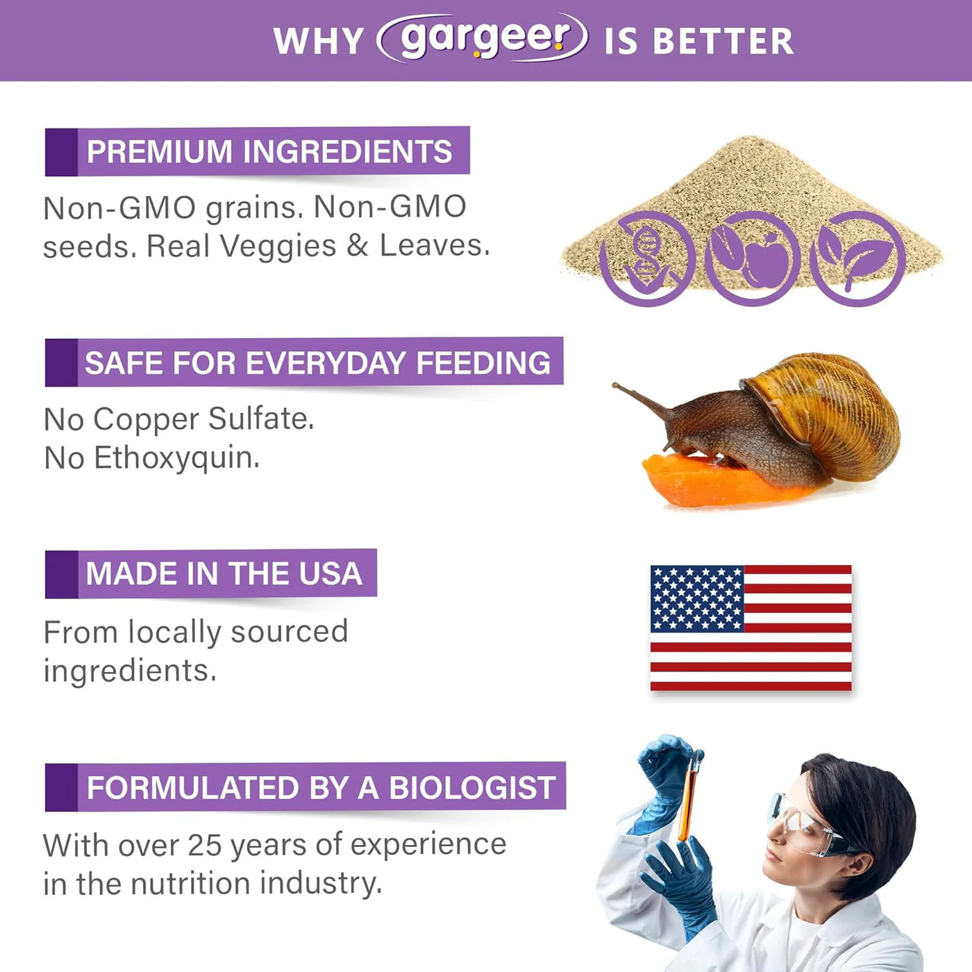 Gargeer Land Snail Veggie Complete Diet is formulated with a blend of premium, nutrient-rich ingredients including Non-GMO Oats, Hemp Seeds, Pumpkin Seeds, Black Soldier Fly Larvae, Dandelion Leaf, Dried Mushroom, and Sweet Potato. These ingredients are packed with essential vitamins, minerals, and proteins necessary for the health and vitality of land snails.
