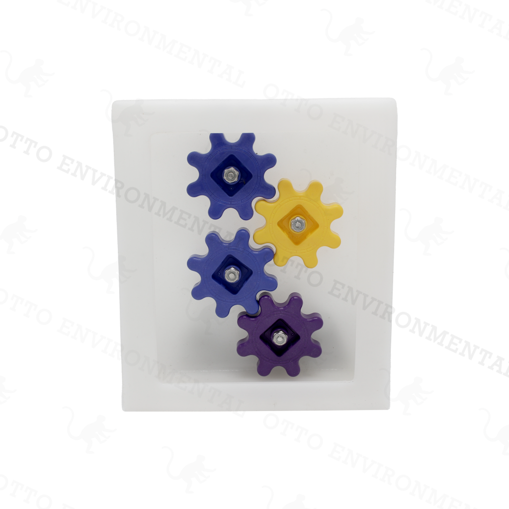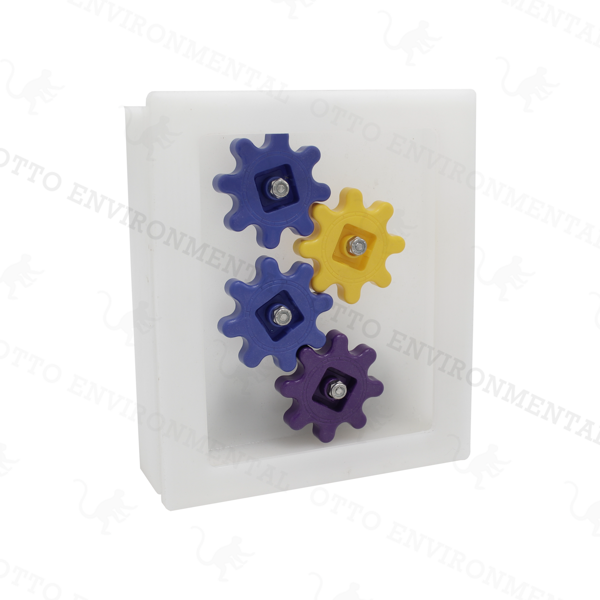 The Gear Connect enrichment device uses colorful plastic gears to encourage primates such as monkeys and apes including tamarins, capuchins, marmosets, macaques, langurs, orangutans, gibbons, and chimpanzees to touch and spin the gears. The Gear Connect provides visual, tactile, and audible stimulation as the gears are explored. The rugged gears are mounted on stainless-steel hardware inside a polyethylene enclosure. The Gear Connect is part of the Primate Enrichment System (PES) family of products. The PES system is designed for animal enrichment for animal transportation, laboratory settings, veterinary enclosures, and zoo habitats. All PES components are autoclavable making it easy to maintain hygiene and IACUC standards in laboratory settings.