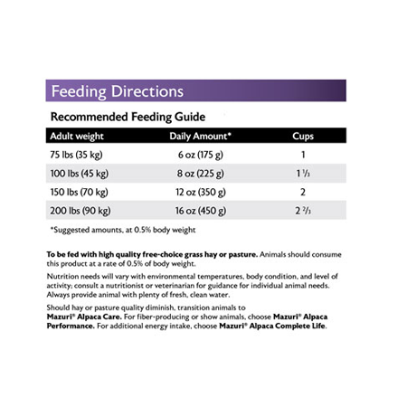 Mazuri Alpaca & Llama Maintenance Diet is a fortified feed to maintain adult alpacas and llamas. This product is designed to be fed with high-quality, free-choice grass hay or pasture. This product is not designed for growing, gestating or lactating, or fiber-producing animals.