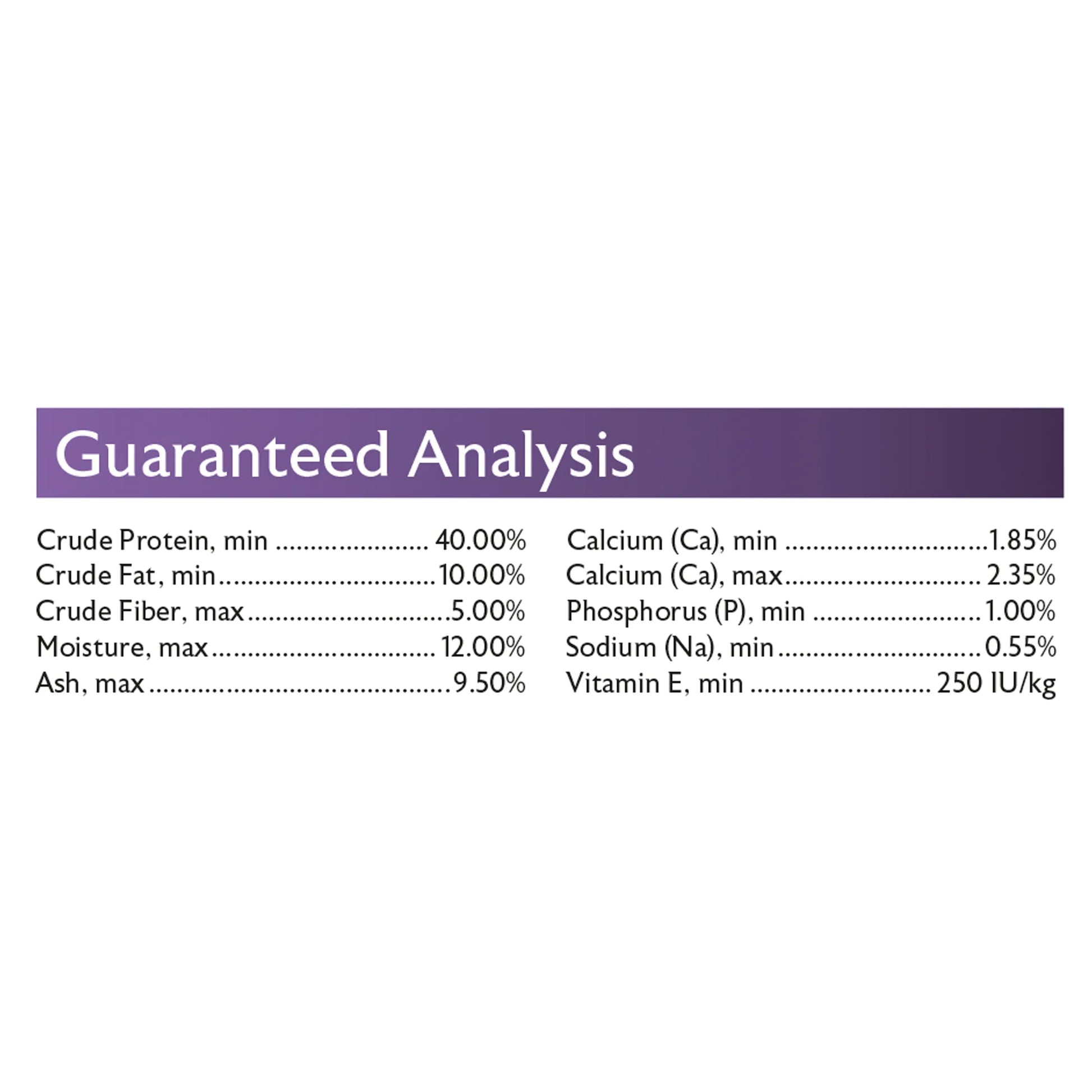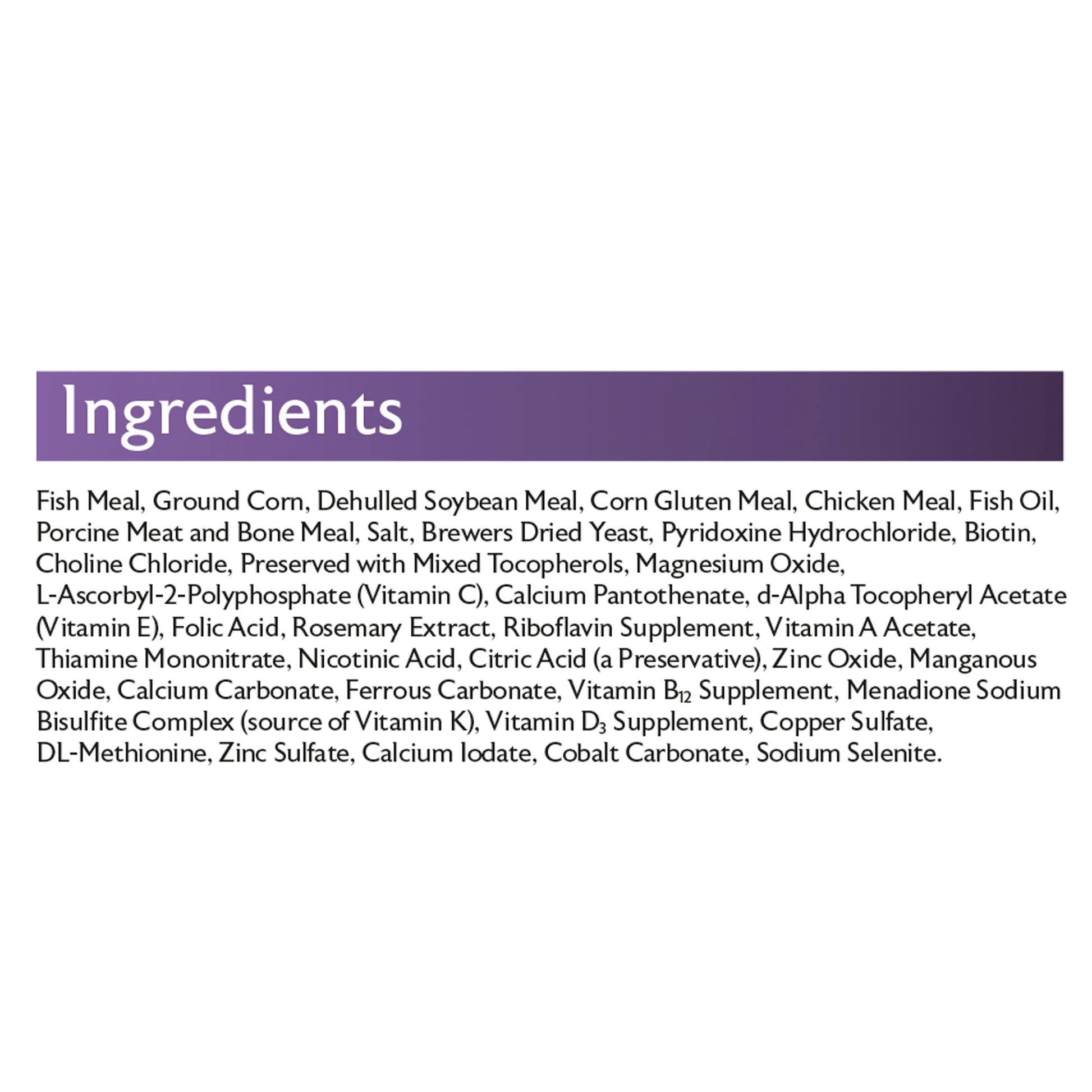 Fish Meal, Ground Corn, Dehulled Soybean Meal, Corn Gluten Meal, Chicken Meal, Fish Oil, Porcine Meat and Bone Meal, Salt, Brewers Dried Yeast, Pyridoxine Hydrochloride, Biotin, Choline Chloride, Preserved with Mixed Tocopherols, Magnesium Oxide, L-Ascorbyl-2-Polyphosphate (Vitamin C), Calcium Pantothenate, d-Alpha Tocopheryl Acetate (Vitamin E), Folic Acid, Rosemary Extract, Riboflavin Supplement, Vitamin A Acetate, Thiamine Mononitrate, Nicotinic Acid, Citric Acid (a Preservative), Zinc Oxide, Manganous Oxide, Calcium Carbonate, Ferrous Carbonate, Vitamin B12 Supplement, Menadione Sodium Bisulfite Complex (Vitamin K), Vitamin D3 Supplement, Copper Sulfate, DL-Methionine, Zinc Sulfate, Calcium Iodate, Cobalt Carbonate, Sodium Selenite.