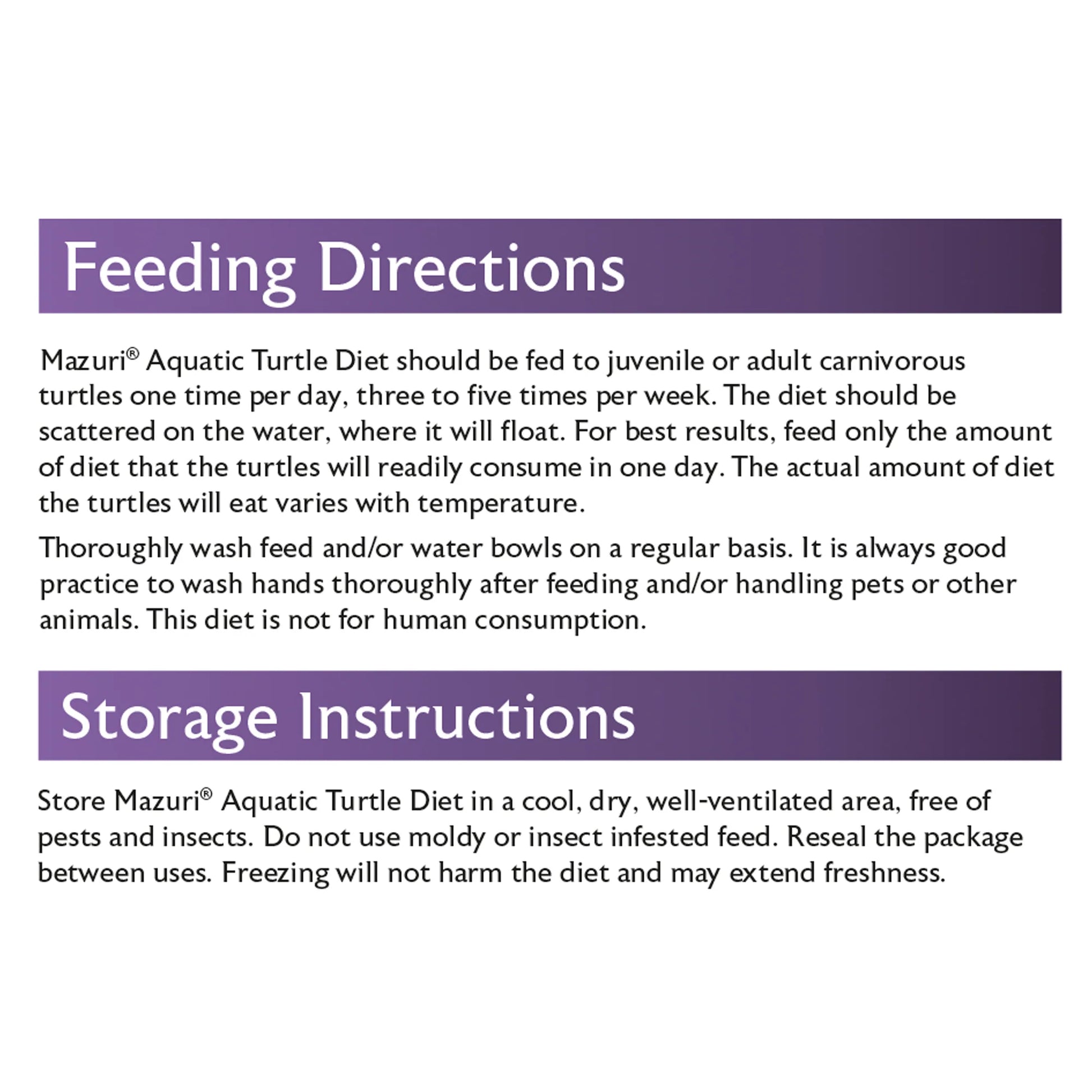 Mazuri Aquatic Turtle Diet is a complete turtle food for freshwater turtles, such as painted and red-eared turtles, at all stages of life. This floating pellet turtle food is designed to be tossed into the water to encourage animals to come to the surface for feeding. With high levels of fish and animal protein, this turtle diet meets the needs of carnivorous species.