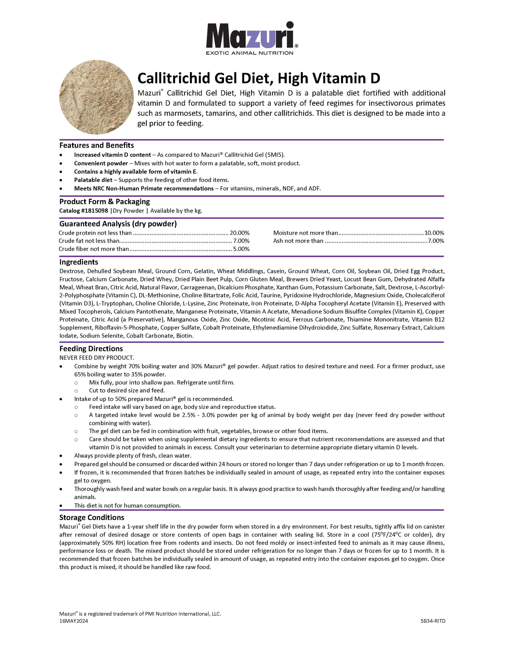 Mazuri Callitrichid Gel Diet, High Vitamin D is an easy-to-prepare Callitrichid diet that provides extra vitamin D for insectivorous primates. This primate food is shipped as a powder that is designed to be made into a gel prior to feeding. Mazuri gel diets are highly palatable and have a long shelf life in the powder form.
