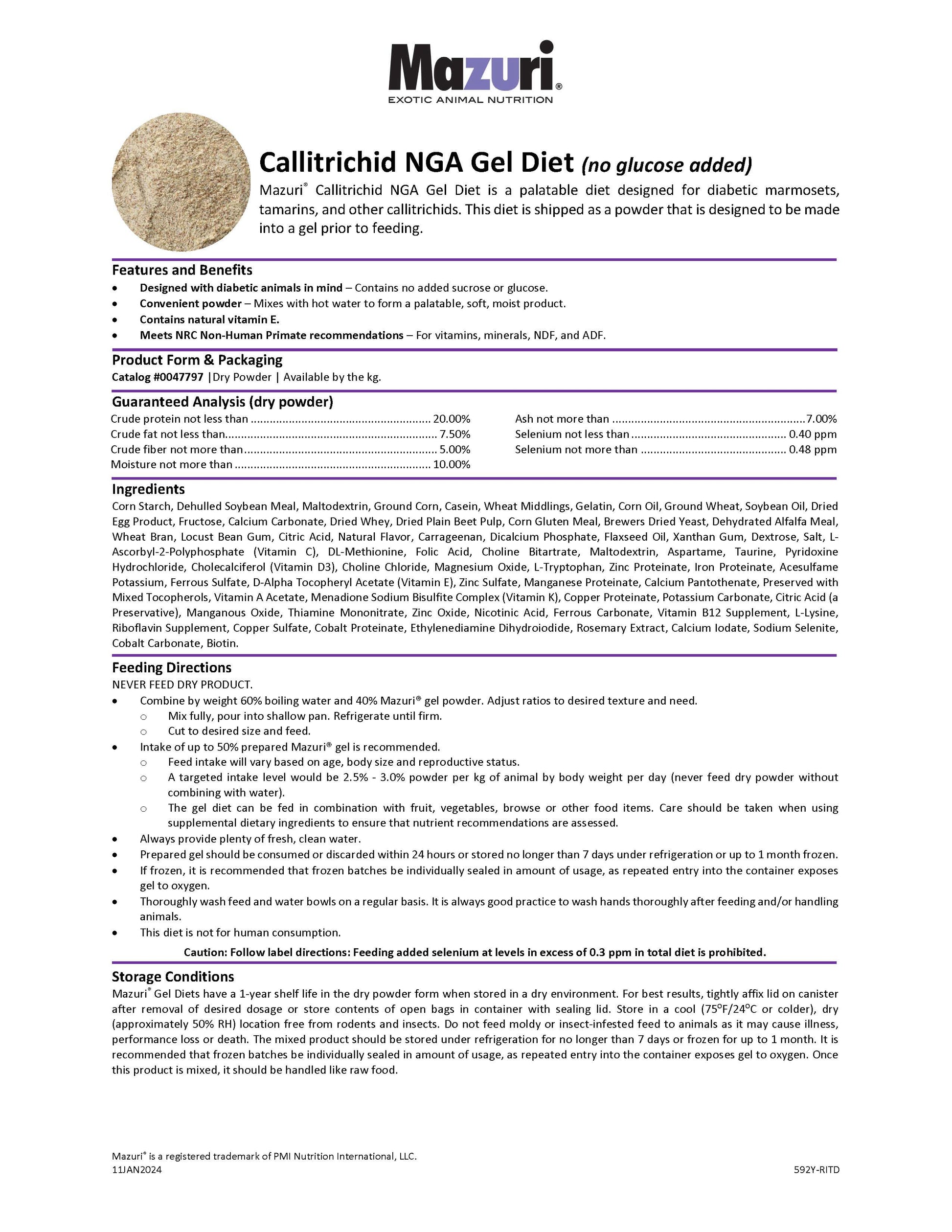 Mazuri Callitrichid Gel Diet - No Glucose Added is an easy-to-prepare callitrichid diet that meets the needs of diabetic insectivorous primates. This sucrose- and glucose-free primate food is shipped as a powder that is designed to be made into a gel prior to feeding. Mazuri gel diets are highly palatable and have a long shelf life in the powder form.