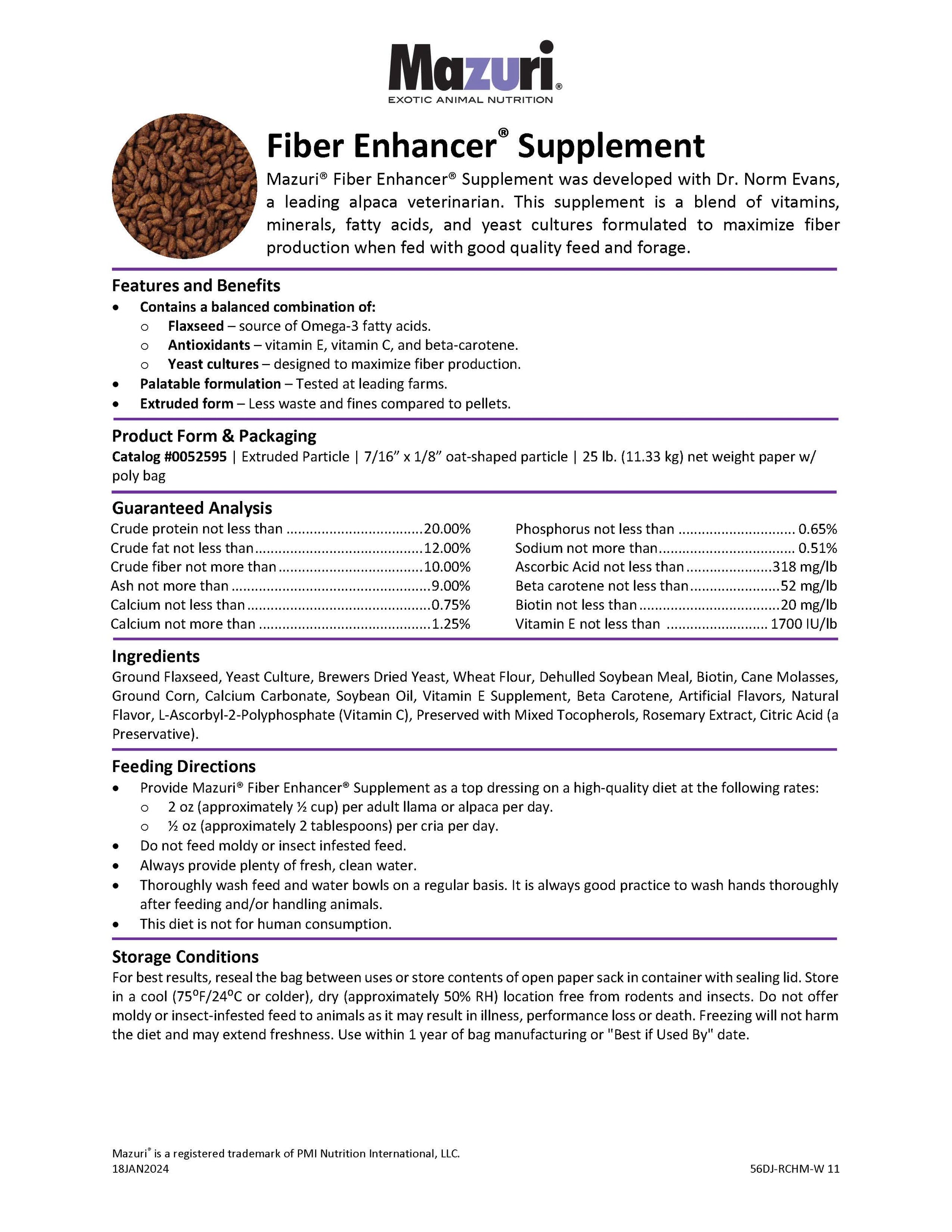 Mazuri® Fiber Enhancer Supplement, an alpaca and llama supplement, is a blend of vitamins, minerals, fatty acids and yeast cultures that helps support fiber production when fed with high quality alpaca feed and forage.