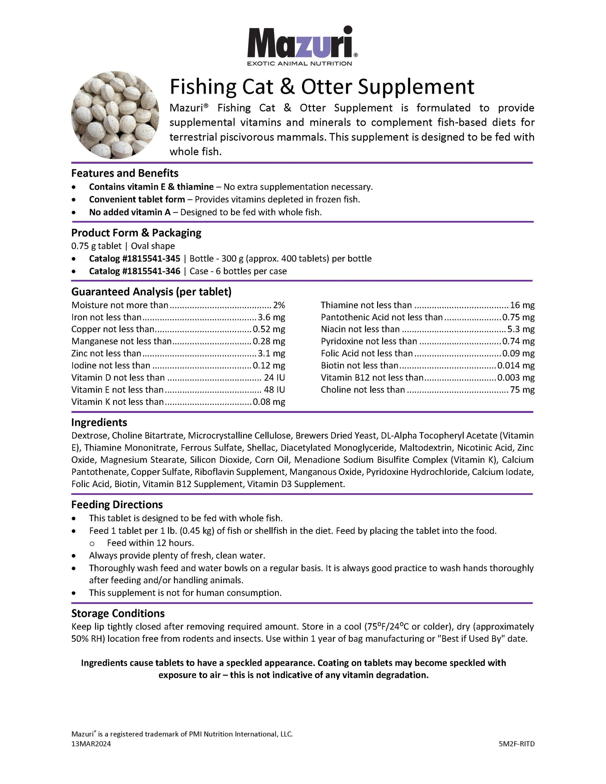 Mazuri Fishing Cat & Otter Supplement is formulated to provide supplemental vitamins and minerals to complement fish-based diets for terrestrial piscivorous mammals.