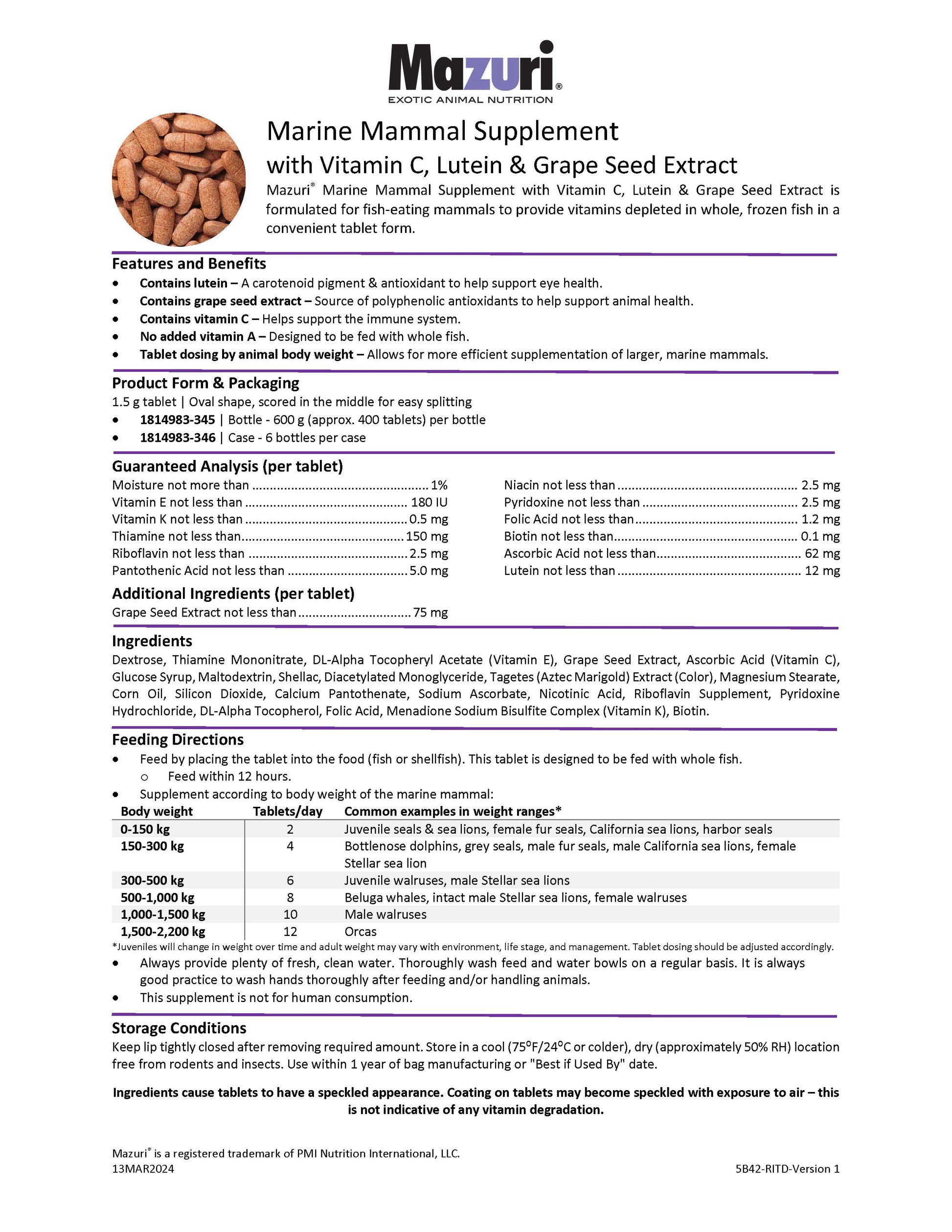 Mazuri Marine Mammal Supplement with Vitamin C, Lutein & Grape Seed Extract 5B42 - 1 Bottle