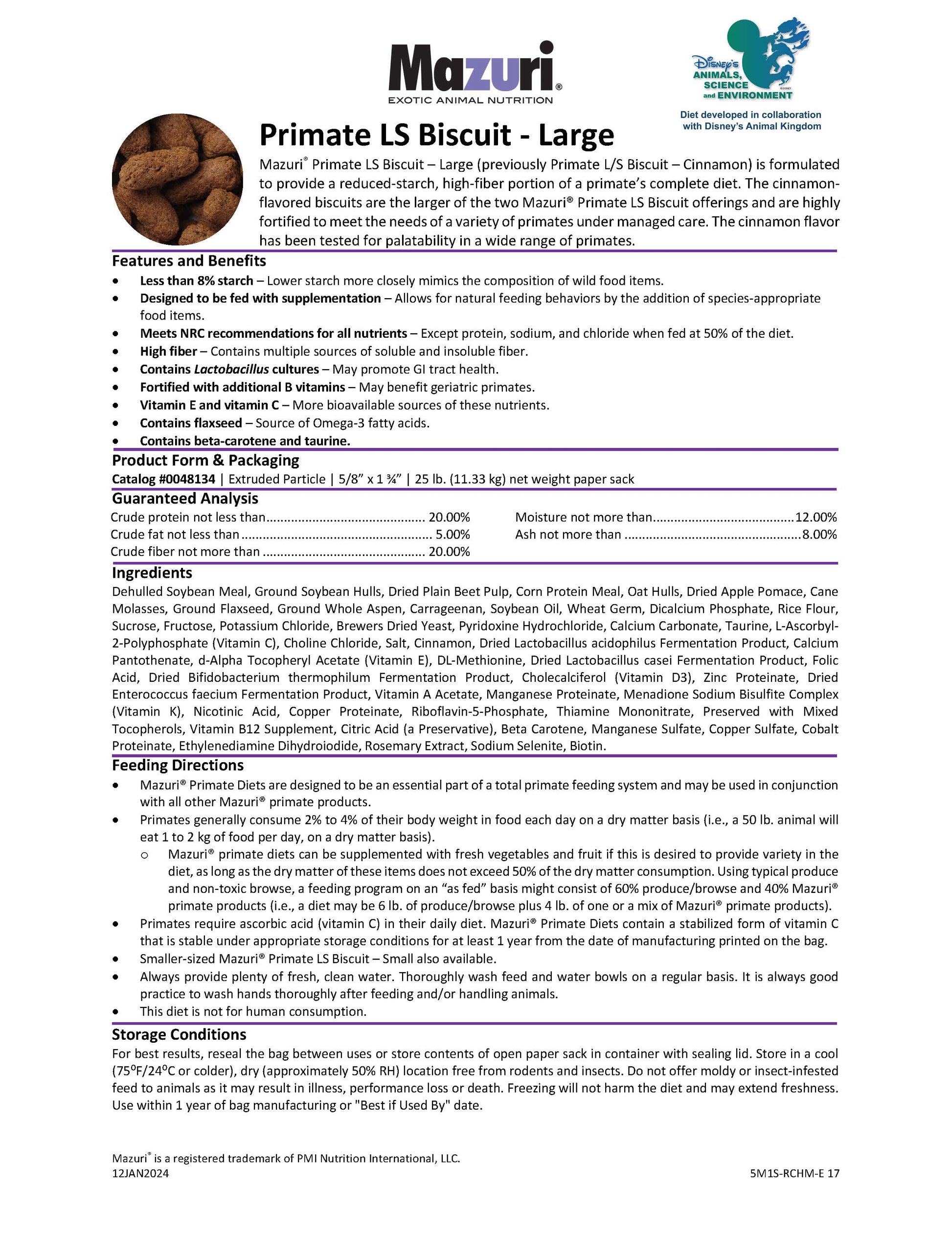 Mazuri® Primate LS Biscuit — Large (formerly Primate L/S Biscuit — Cinnamon) is formulated to provide a reduced-starch, high-fiber portion of a primate's complete diet. The cinnamon-flavored biscuits are the larger of the two Mazuri® Primate LS Biscuit offerings and are highly fortified to meet the needs of a variety of primates under managed care. The cinnamon flavor has been tested for palatability in a wide range of primates.