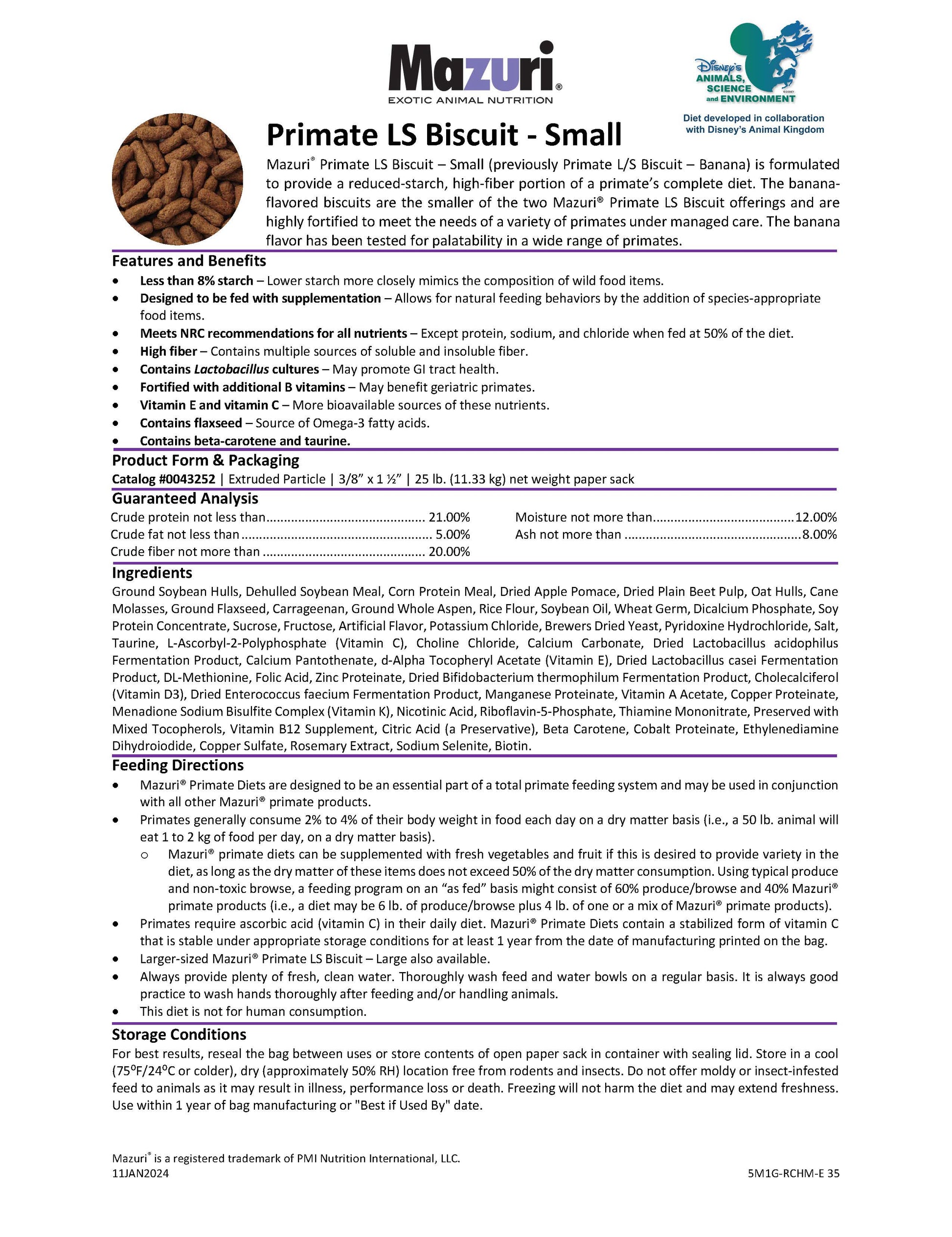 Mazuri® Primate LS Biscuit — Small (previously Primate L/S Biscuit — Banana) is formulated to provide a reduced-starch, high-fiber portion of a primate's complete diet. The banana-flavored biscuits are the smaller of the two Mazuri® Primate LS Biscuit offerings and are highly fortified to meet the needs of a variety of primates under managed care. The banana flavor has been tested for palatability in a wide range of primates.