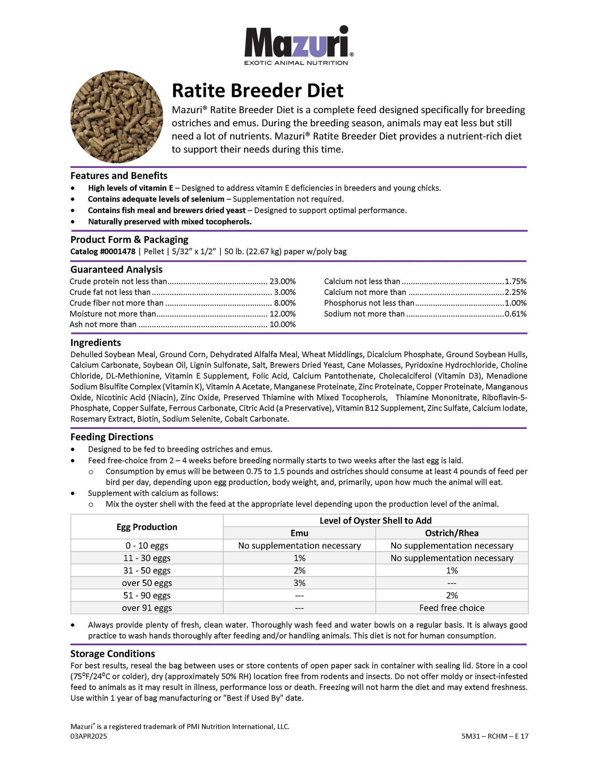 Mazuri® Ratite Breeder Diet is a complete ratite food designed specifically for breeding ratites. This nutrient-dense ratite diet is designed to provide nutrients at sufficient levels during breeding while reducing feed consumption.