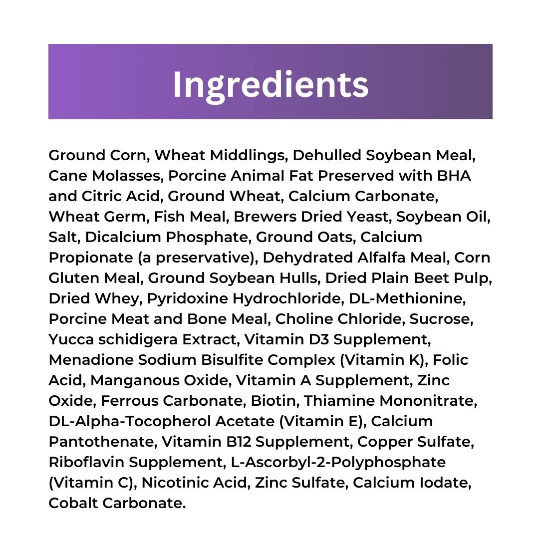 Ground Corn, Dehulled Soybean Meal, Wheat Middlings, Ground Wheat, Cane Molasses, Soybean Oil, Fish Meal, Wheat Germ, Porcine Animal Fat Preserved with BHA and Citric Acid, Ground Oats, Brewers Dried Yeast, Calcium Carbonate, Salt, Dehydrated Alfalfa Meal, Corn Gluten Meal, Ground Soybean Hulls, Dried Plain Beet Pulp, Dicalcium Phosphate, Calcium Propionate (a preservative), Dried Whey, Porcine Meat and Bone Meal, Pyridoxine Hydrochloride, Sucrose, Choline Chloride, DLMethionine, Yucca schidigera Extract, Menadione Sodium Bisulfite Complex (Vitamin K), Cholecalciferol (Vitamin D3), Manganous Oxide, Folic Acid, Zinc Oxide, Biotin, Thiamine Mononitrate, Ferrous Carbonate, Vitamin A Acetate, Calcium Pantothenate, DL-Alpha-Tocopherol Acetate (Vitamin E), Vitamin B12 Supplement, Riboflavin Supplement, Copper Sulfate, Nicotinic Acid, Zinc Sulfate, Calcium Iodate, Cobalt Carbonate.