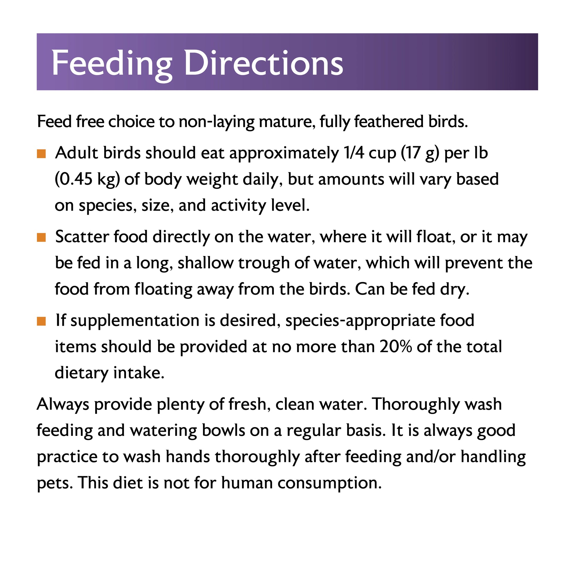 - For birds laying eggs, we recommend Mazuri® Waterfowl Breeder Diet.