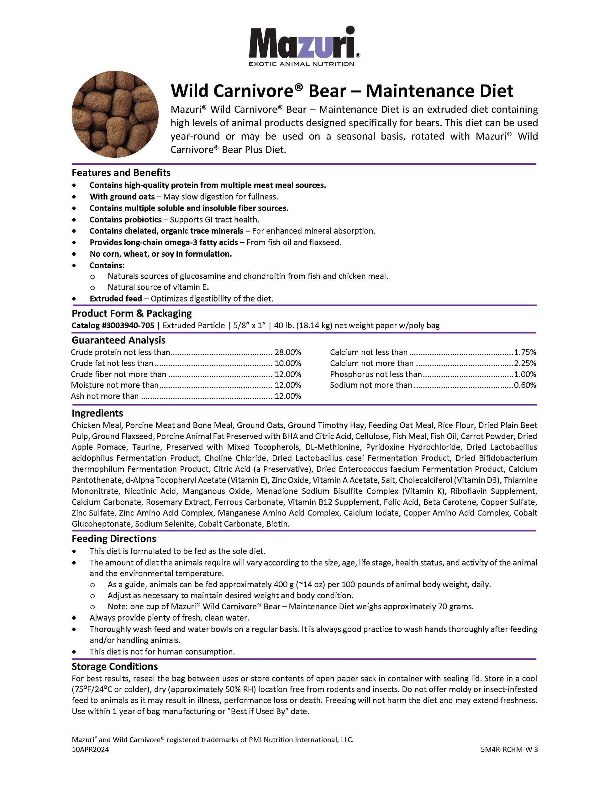 Mazuri® Wild Carnivore® Bear - Maintenance Diet is a high-quality, animal-products-based bear food for polar bears, brown bears and black bears. All Mazuri bear feed is designed to help maintain good coat condition and optimal breeding outcomes. This bear food can be used year-round or may be rotated seasonally with Mazuri Wild Carnivore Bear Plus.