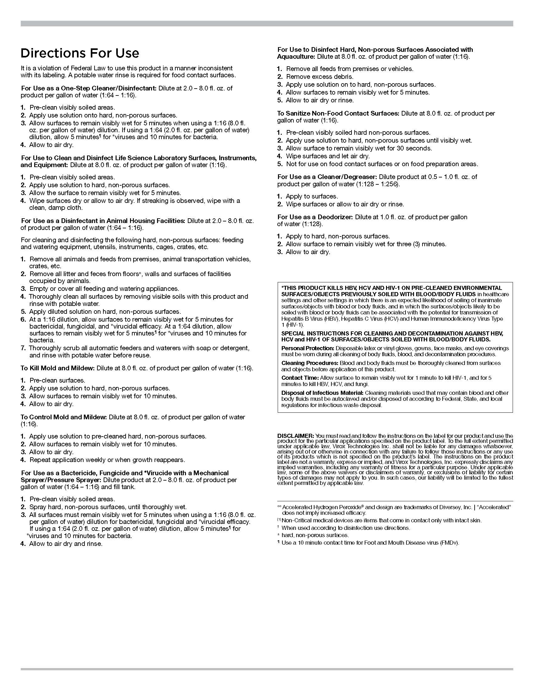 - For cleaning and disinfecting the following hard, non-porous surfaces: feeding and watering equipment, utensils, instruments, cages, crates, etc. 1. Remove all animals and feeds from premises, animal transportation vehicles, crates, etc. 2. Remove all litter and feces from floors, walls and surfaces of facilities occupied by animals. 3. Empty or cover all feeding and watering appliances. 4. Thoroughly clean all surfaces by removing visible soils with this product and rinse with potable water. 5. Apply diluted solution on hard, non-porous surfaces. 6. At a 1:16 dilution, allow surfaces to remain visibly wet for 5 minutes for bactericidal, fungicidal, and *virucidal efficacy. At a 1:64 dilution, allow surfaces to remain visibly wet for 5 minutes for *viruses and 10 minutes for bacteria. 7. Thoroughly scrub all automatic feeders and waterers with soap or detergent, and rinse with potable water before reuse.