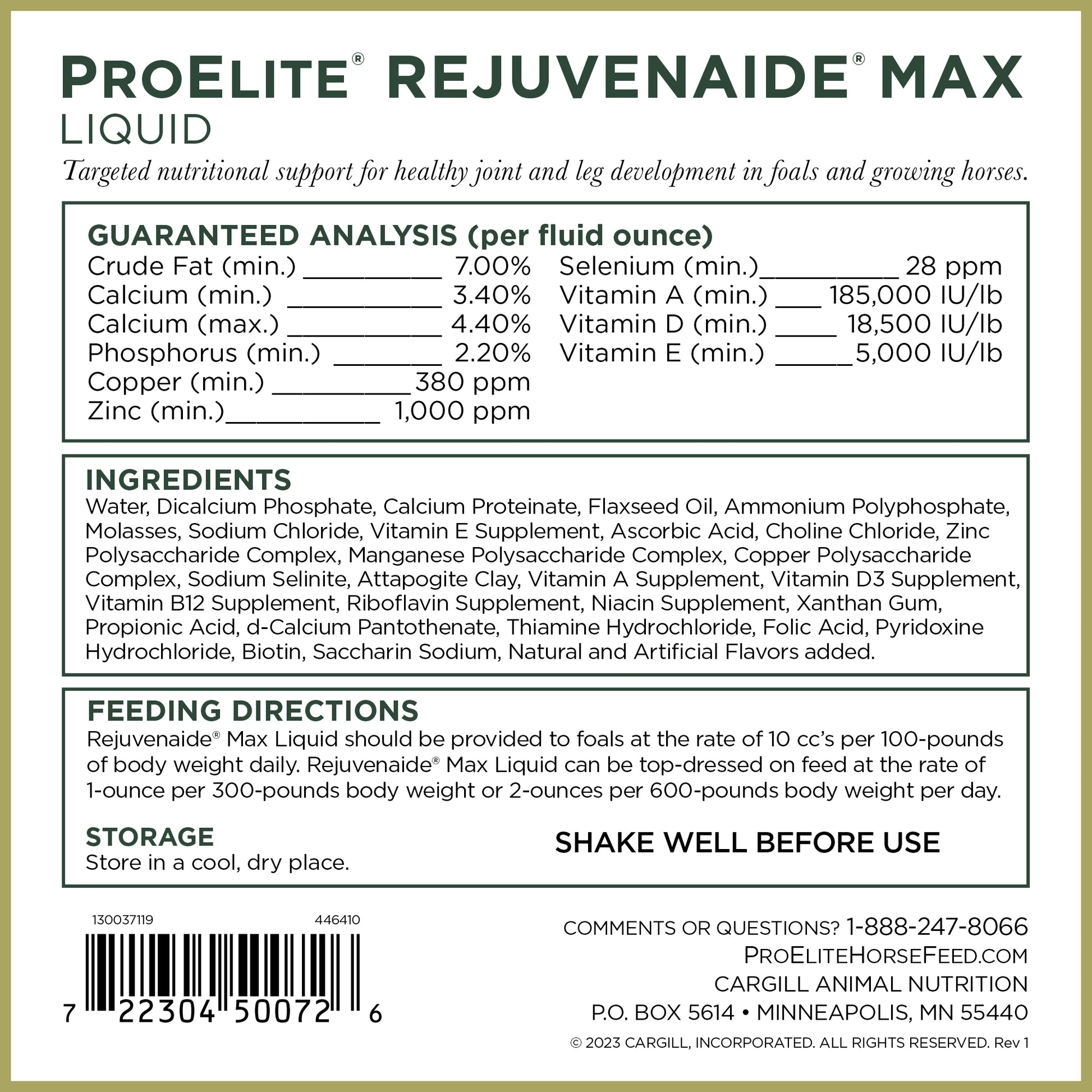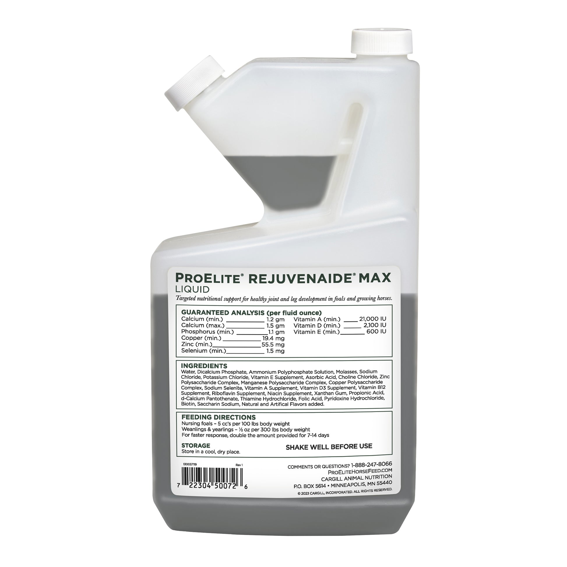 ProElite® Rejuvenaide Max Liquid is an ultra-premium equine feed supplement targeting nutritional support for healthy joint and leg development in foals and growing horses. This top-dress supplement is designed to help promote normal growth and healthy leg development.
