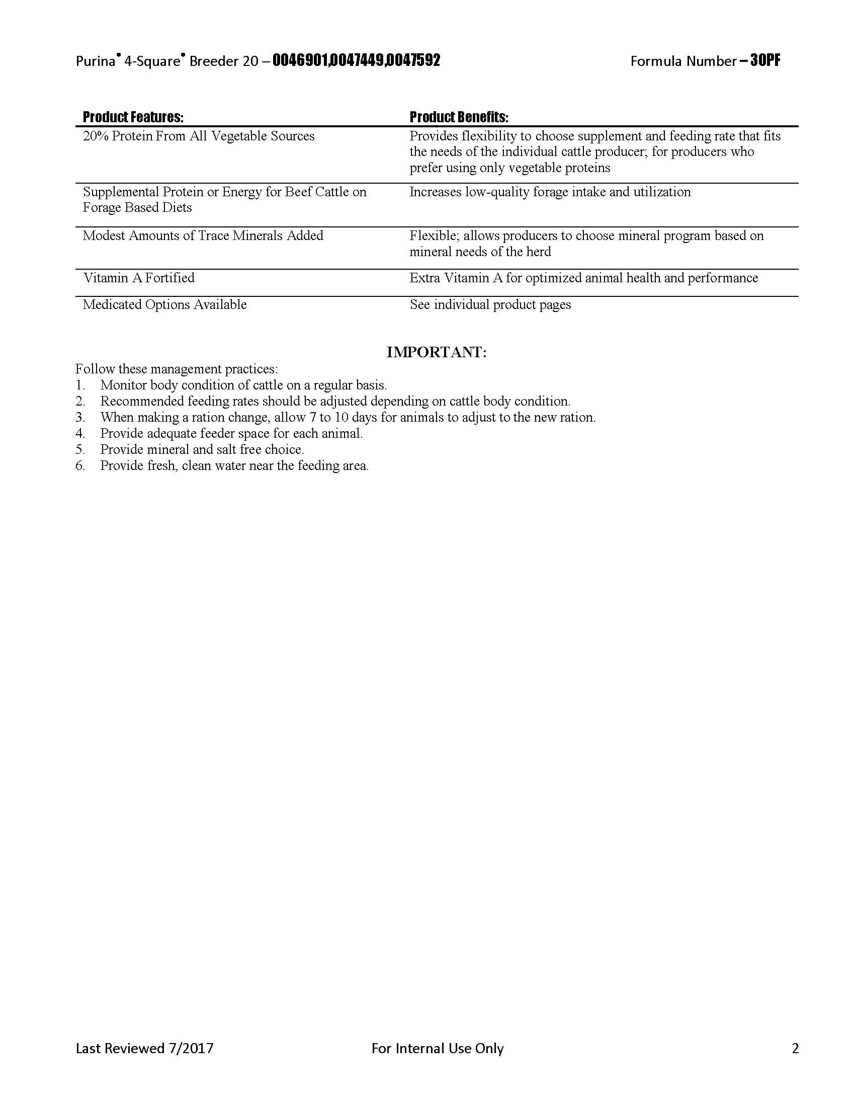 Purina® 4-Square Breeder 20 is a 20% cube supplement that when fed at the recommended rate, balances the nutritional deficiencies in fair-quality forage (native or improved grass hay) or poor quality forage (dormant grasses or crop residues).