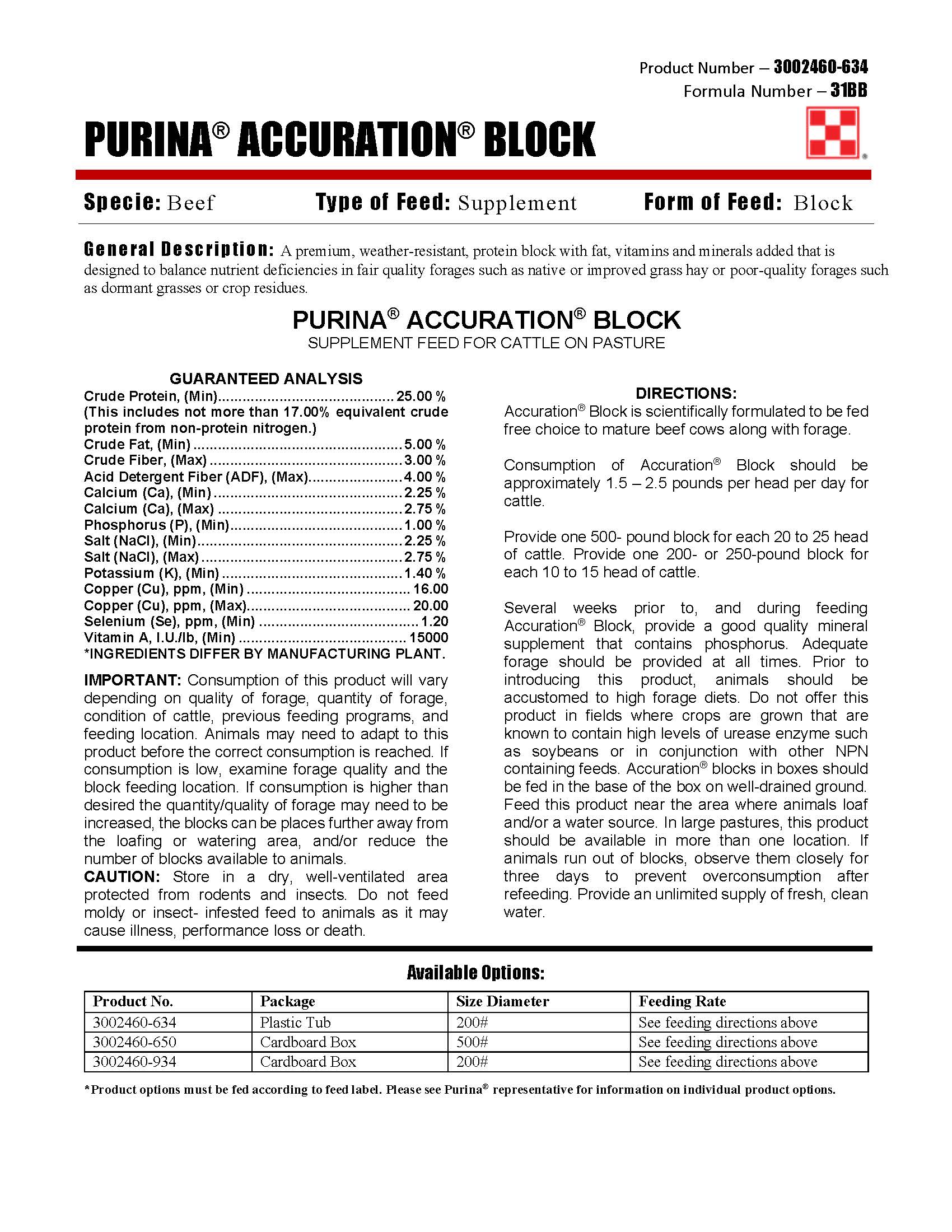 Purina Accuration Block is a premium, weather-resistant, protein block with fat, vitamins and minerals added that is designed to balance nutrient deficiencies in fair quality forages such as native or improved grass hay or poor-quality forages such as dormant grasses or crop residues.