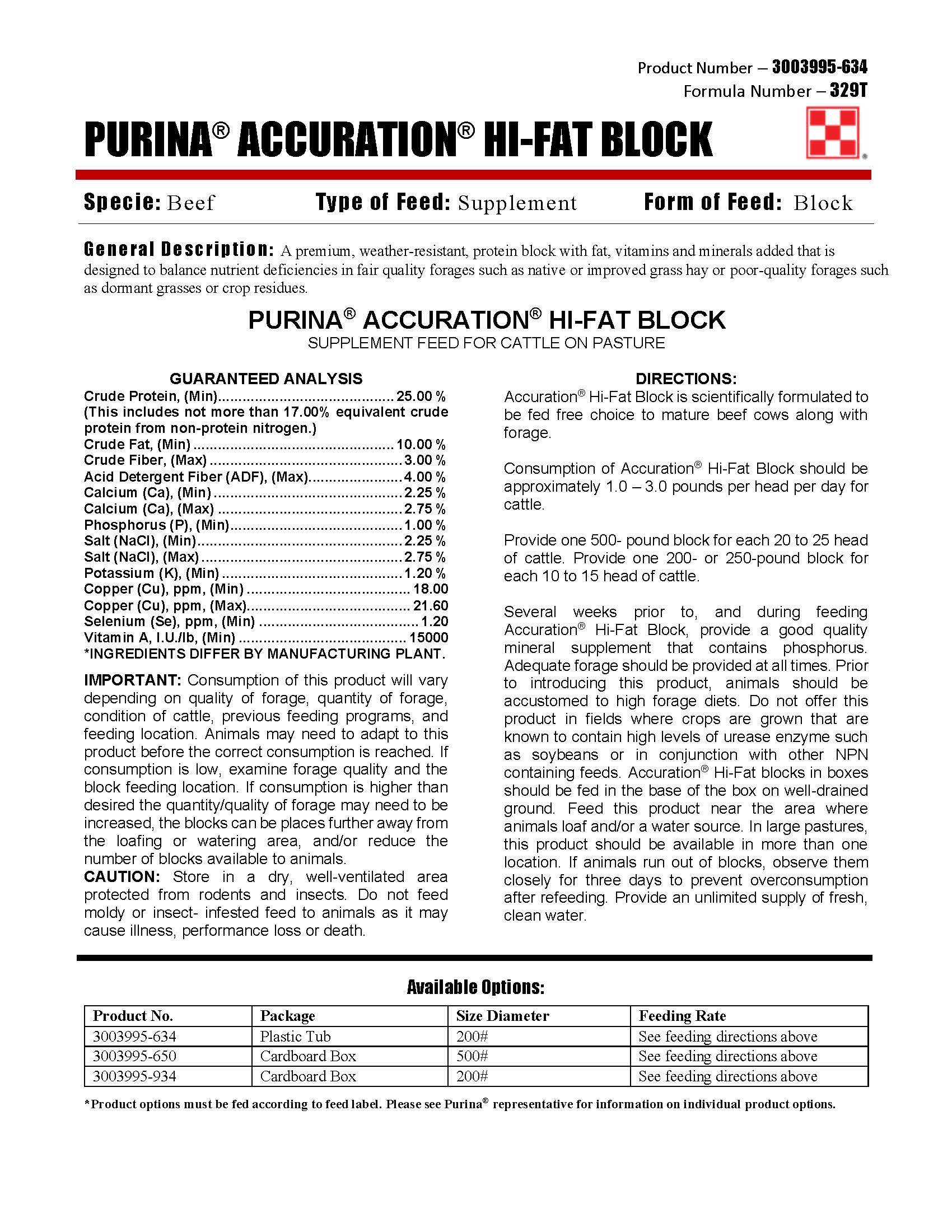 Purina Accuration Hi-Fat Block is a premium, weather-resistant, protein block with Intake Modifying Technology®, formulated with a higher level of fat that is designed to provide additional energy to balance nutrient deficiencies in poor quality forages or for cattle lacking energy in their diet.