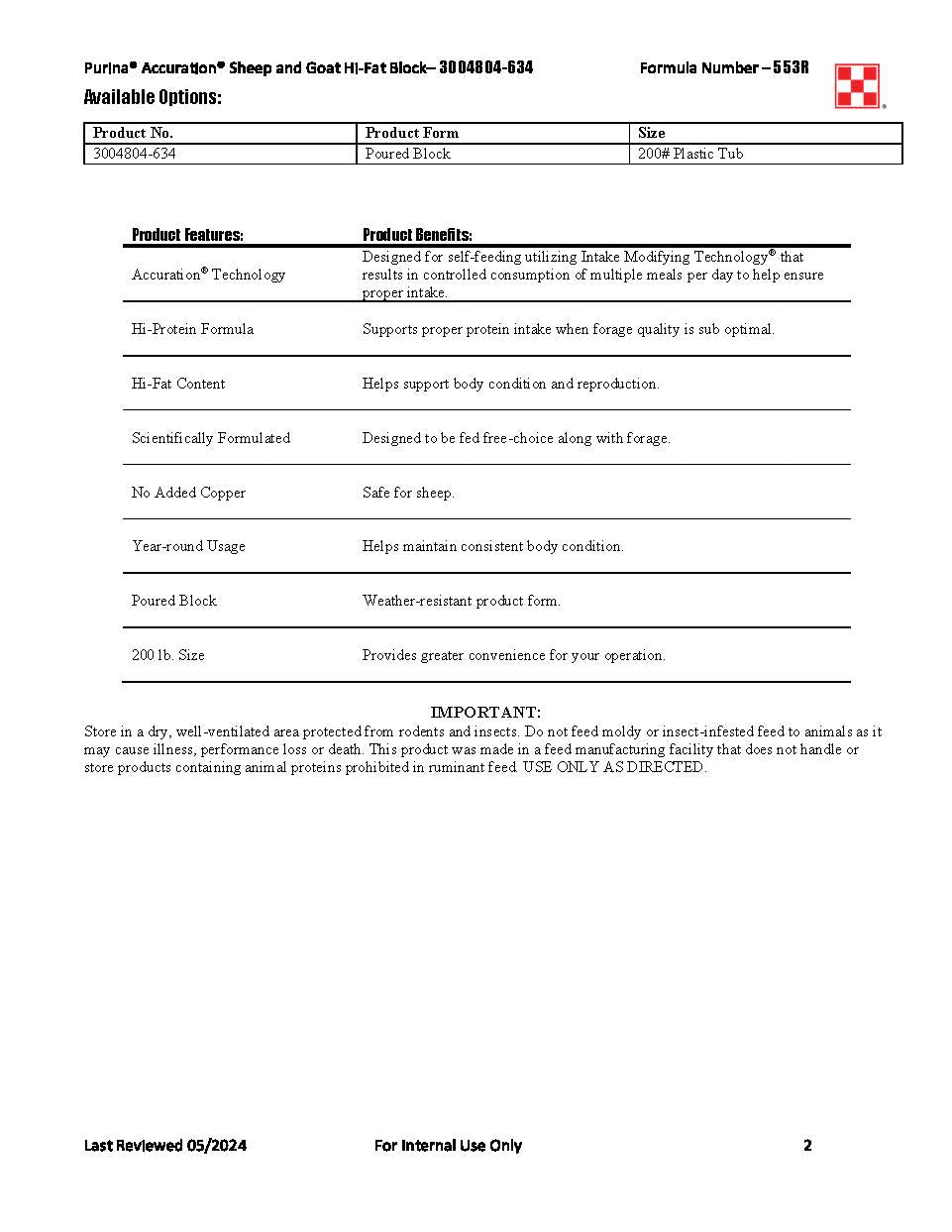 Purina® Accuration® Sheep & Goat Hi-Fat Block is a premium, weather-resistant, protein block with fat, vitamins and minerals added to balance nutrient deficiencies in fair quality forages. Designed specifically for sheep and goats, Purina® Accuration® Sheep & Goat Hi-Fat Block provides convenience and peace of mind for your entire herd.