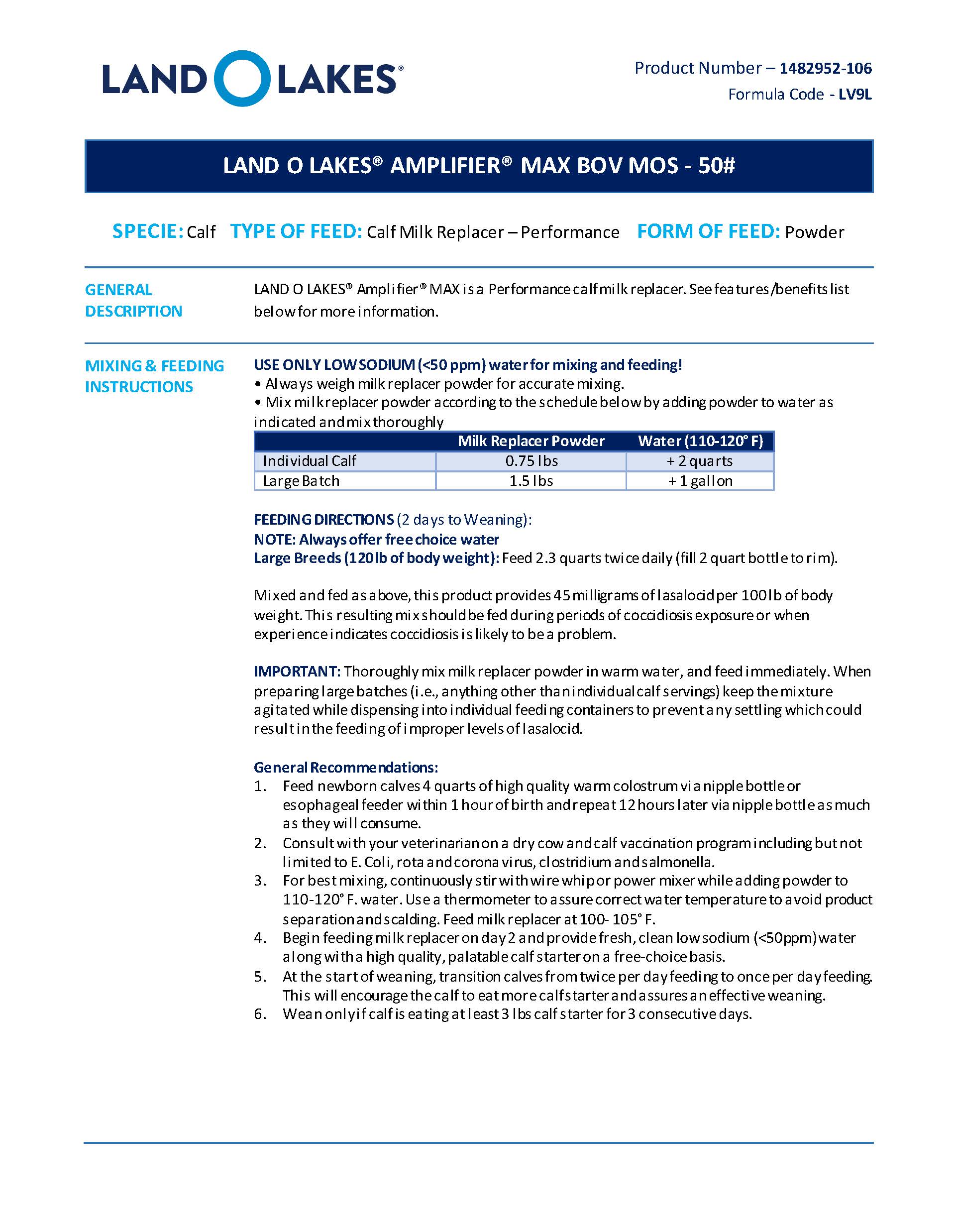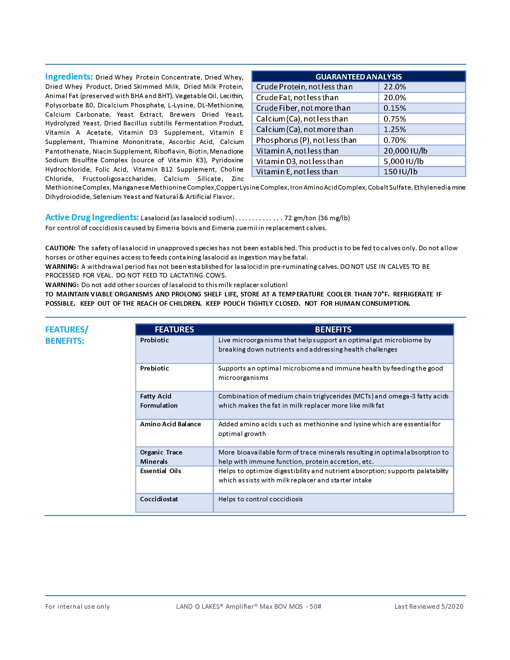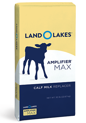 LAND O LAKES® Amplifier® Max is a calf milk replacer with a performance level plane of nutrition. This product contains probiotics and prebiotics to help support a proper balance in the gut microbiome to assist calves in breaking down nutrients for energy and addressing health challenges. This product is also enhanced with optimizing technologies, including a unique combination of essential oils and flavors, that support weight gain. 22% Protein / 20% Fat