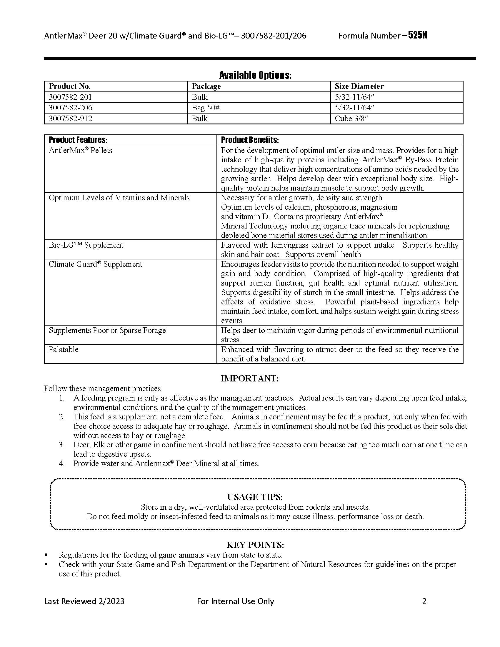 ANTLERMAX® DEER 20 FEED is a researched 20% ration with the addition of Climate Guard® and Bio-LG™ supplements. This feed is specifically reformulated for what free range deer require to support overall health, reproductive performance and antler growth.