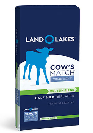 LAND O LAKES® Cow’s Match® ColdFront® Protein Blend calf milk replacer was developed to deliver optimal combinations of protein, energy and feed technologies to help during times of cold stress. This product contains probiotics and prebiotics to help support a proper balance in the gut microbiome to assist calves in breaking down nutrients for energy and addressing health challenges. This product is also enhanced with optimizing technologies, including a unique combination of essential oils and flavors, that support weight gain. A special blend of fatty acids and amino acids allow for optimal energy utilization. The protein blend formula is composed of a variety of proteins that complement each other and offers a lower potential investment cost without sacrificing calf performance. 27% Protein / 20% Fat