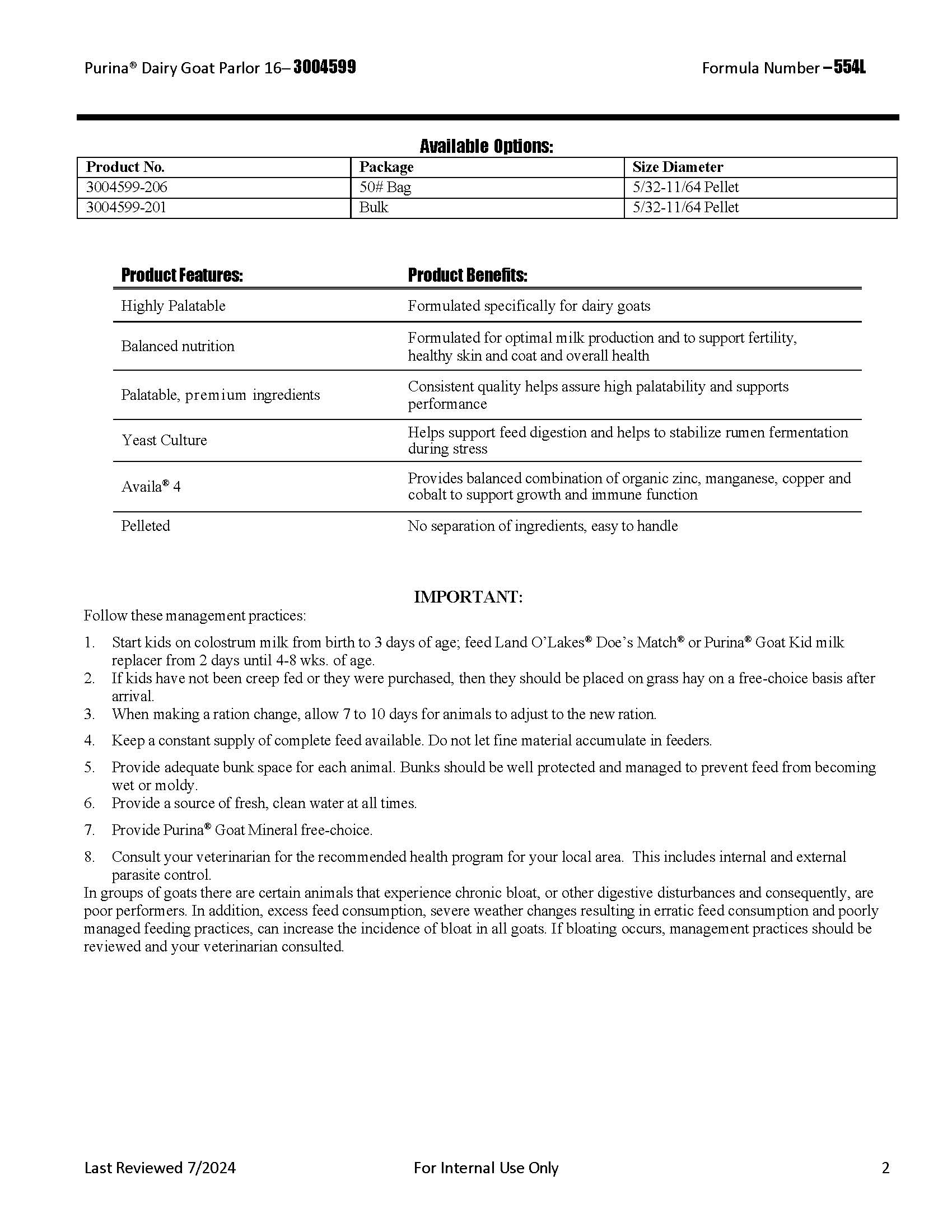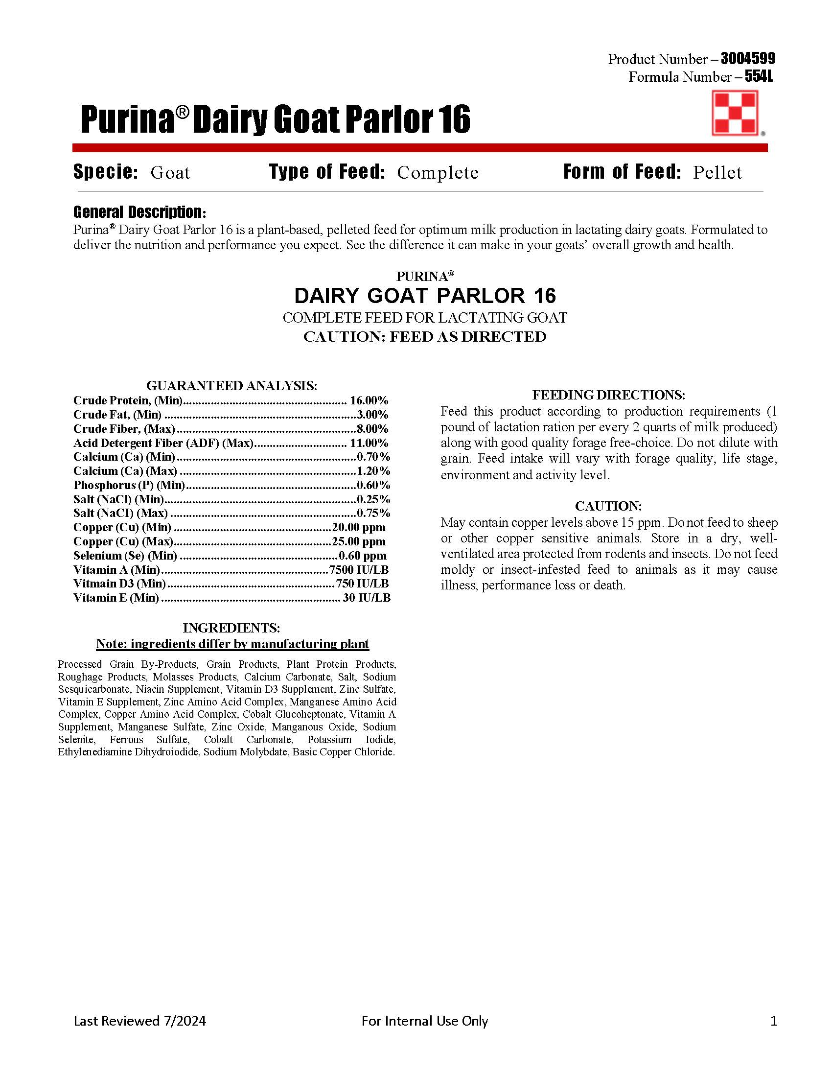 Purina® Dairy Goat Parlor 16 feed is a 16% protein, pelleted feed formulated for optimum milk production in lactating dairy goats. Nutritionally balanced and formulated for optimal milk production and to support fertility, healthy skin and coat and overall health. Also contains Diamond V® yeast culture to help support feed digestion and helps to stabilize rumen fermentation during stress and Availa-4® minerals to optimize growth and help support immune response.