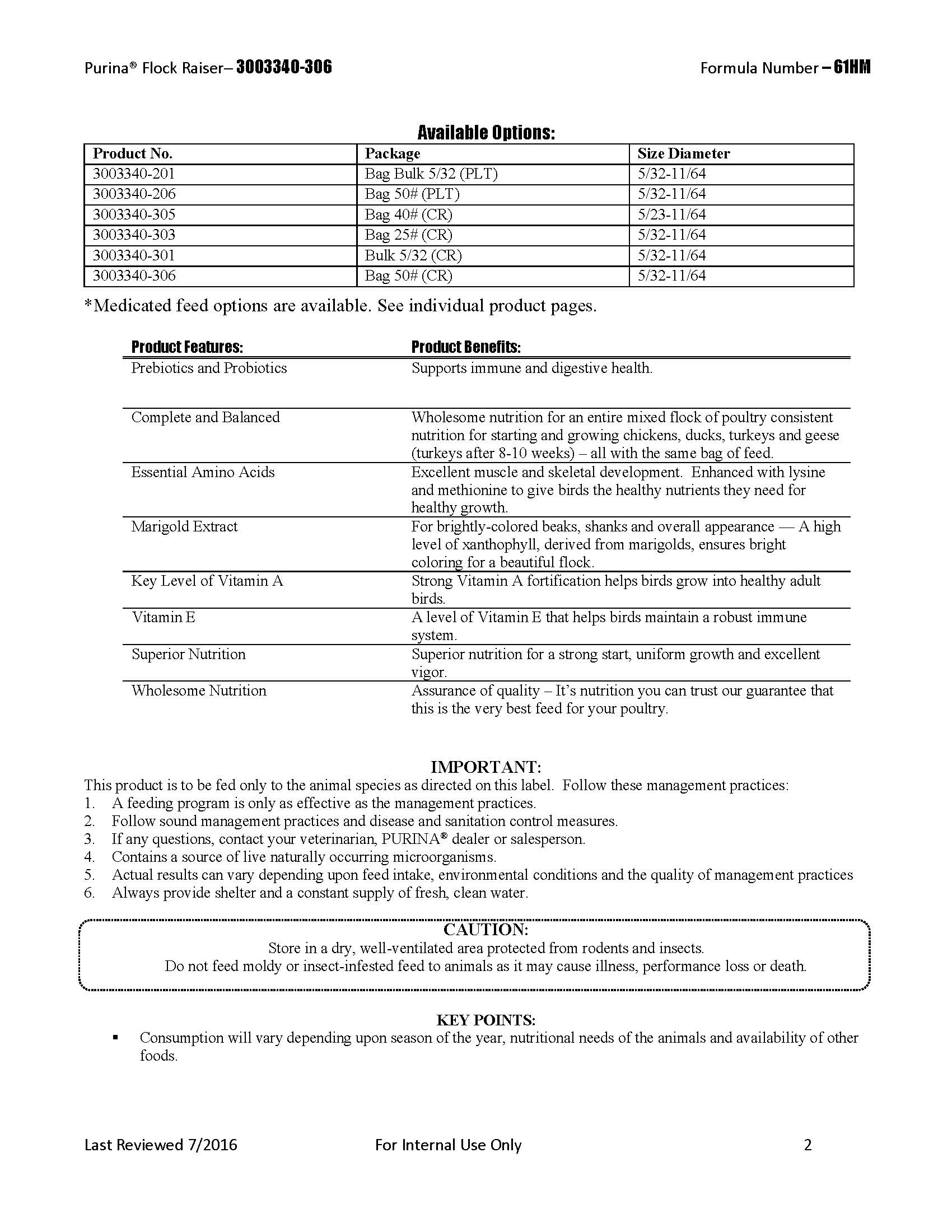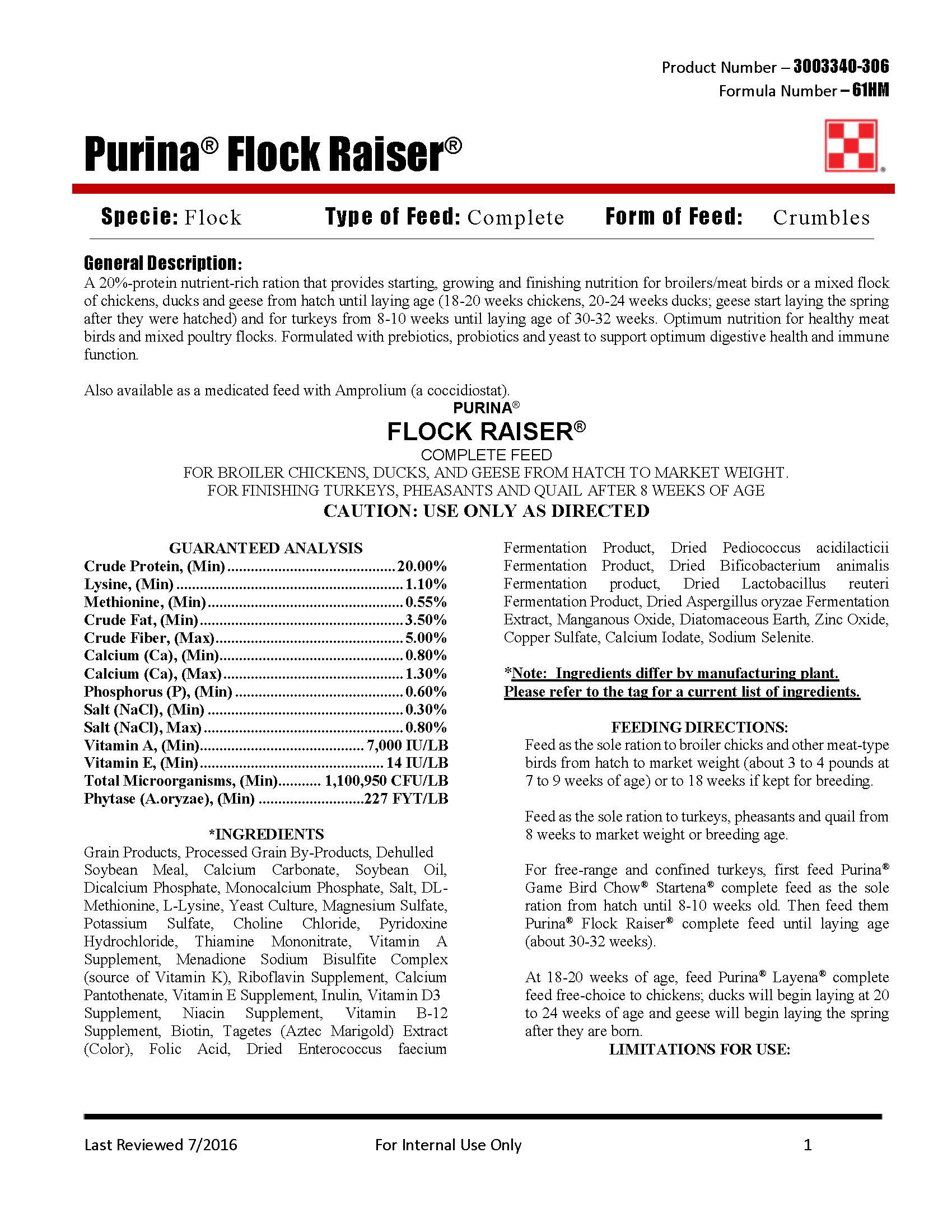 Purina® Flock Raiser® Crumbles is a 20%-protein nutrient-rich ration that provides starting, growing and finishing nutrition for broilers/meat birds or a mixed flock of chickens, ducks and geese from hatch until laying age (18-20 weeks chickens, 20-24 weeks ducks; geese start laying the spring after they were hatched) and for turkeys from 8-10 weeks until laying age of 30-32 weeks.