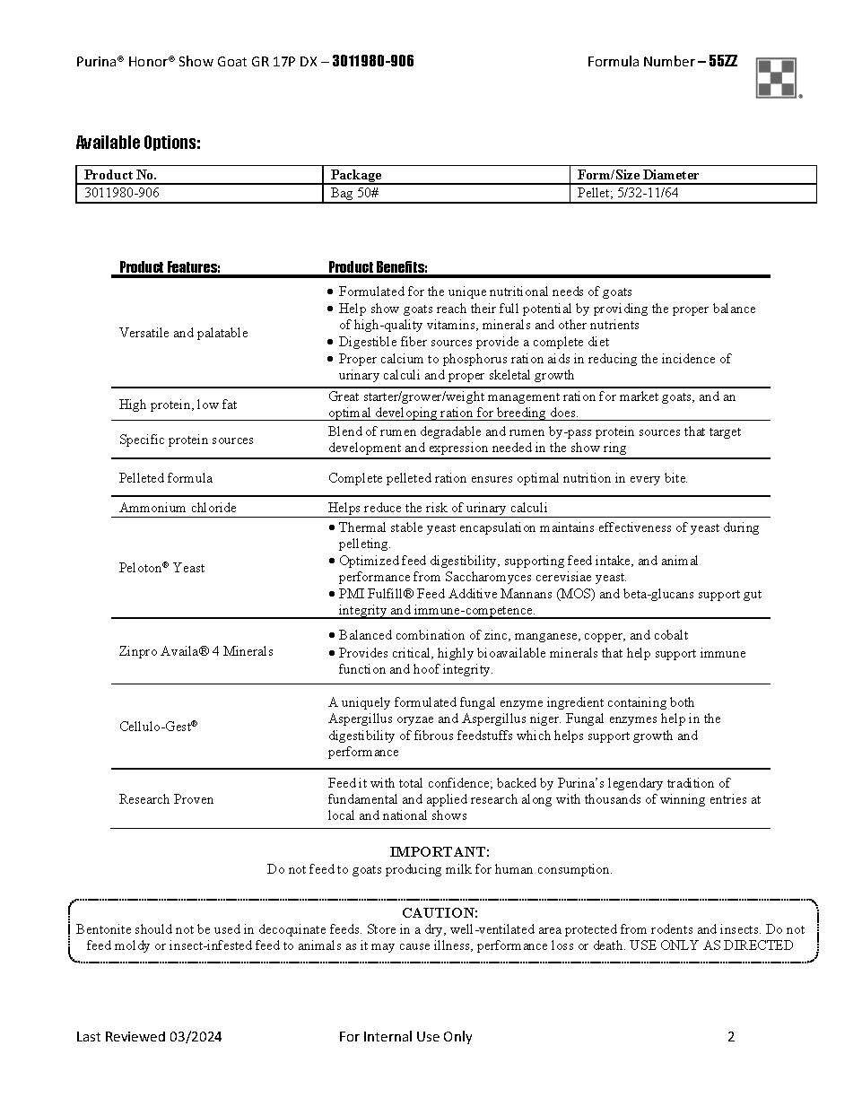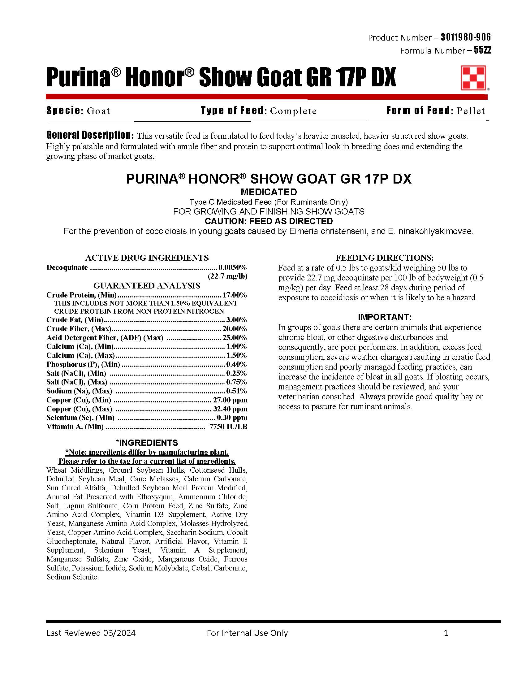 Purina Honor Show Goat GR 17P DX 55ZZ - 50lb