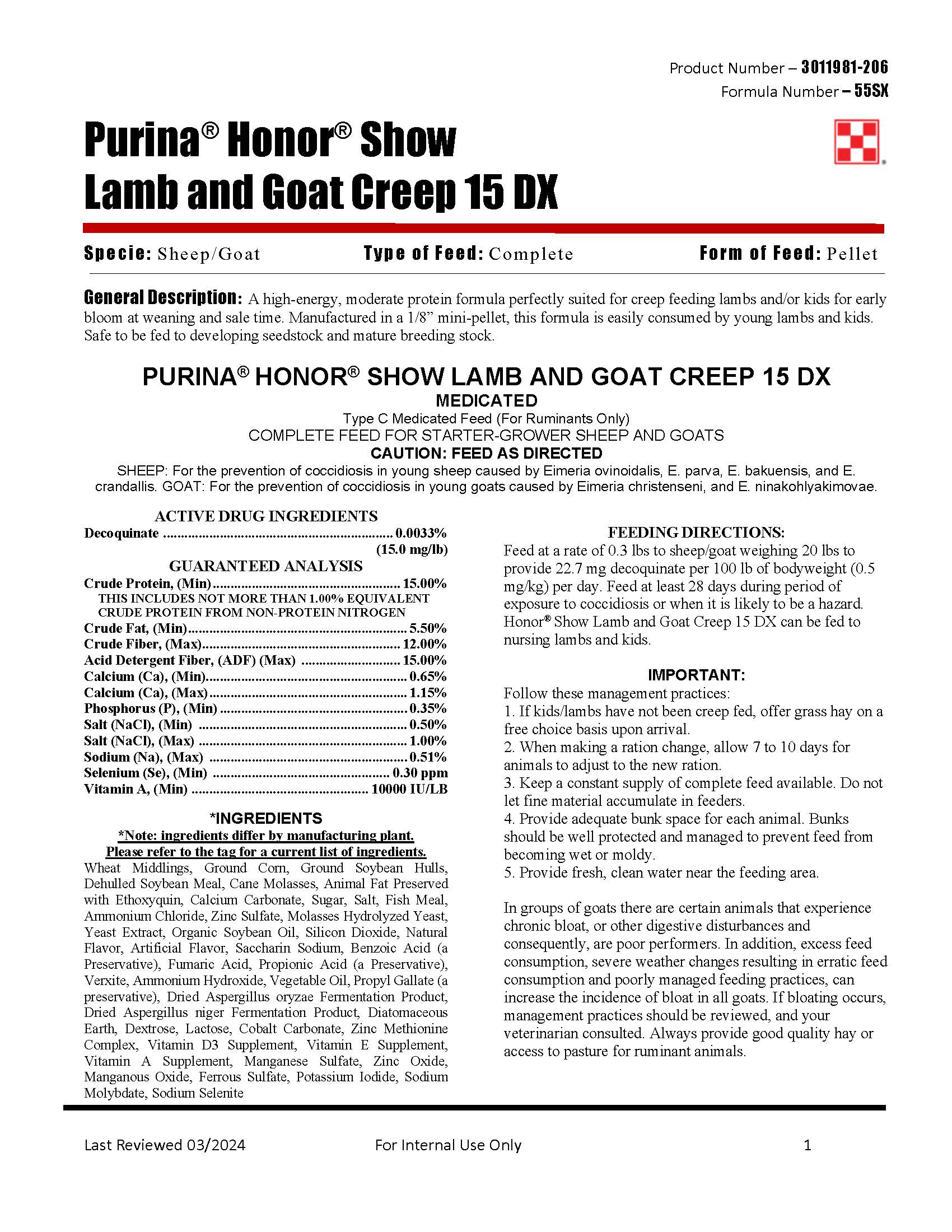 Honor® Show Lamb and Goat Creep 15 DX is designed to help promote early intakes and bloom in young lambs and kids. This high-energy mini pellet encourages early intakes and excellent bloom and growth in young lambs and kids. Deccox® for control of coccidia as well as proper calcium and phosphorus ratio and added ammonium ions to reduce the incidence of urinary calculi.