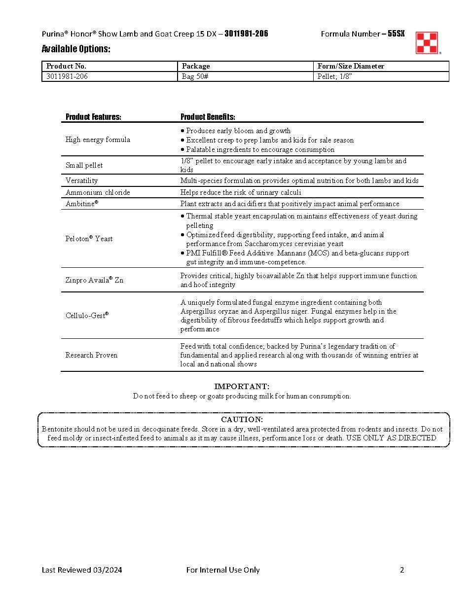 Purina Honor Show Lamb & Goat Creep 15 DX 55SX - 50lb