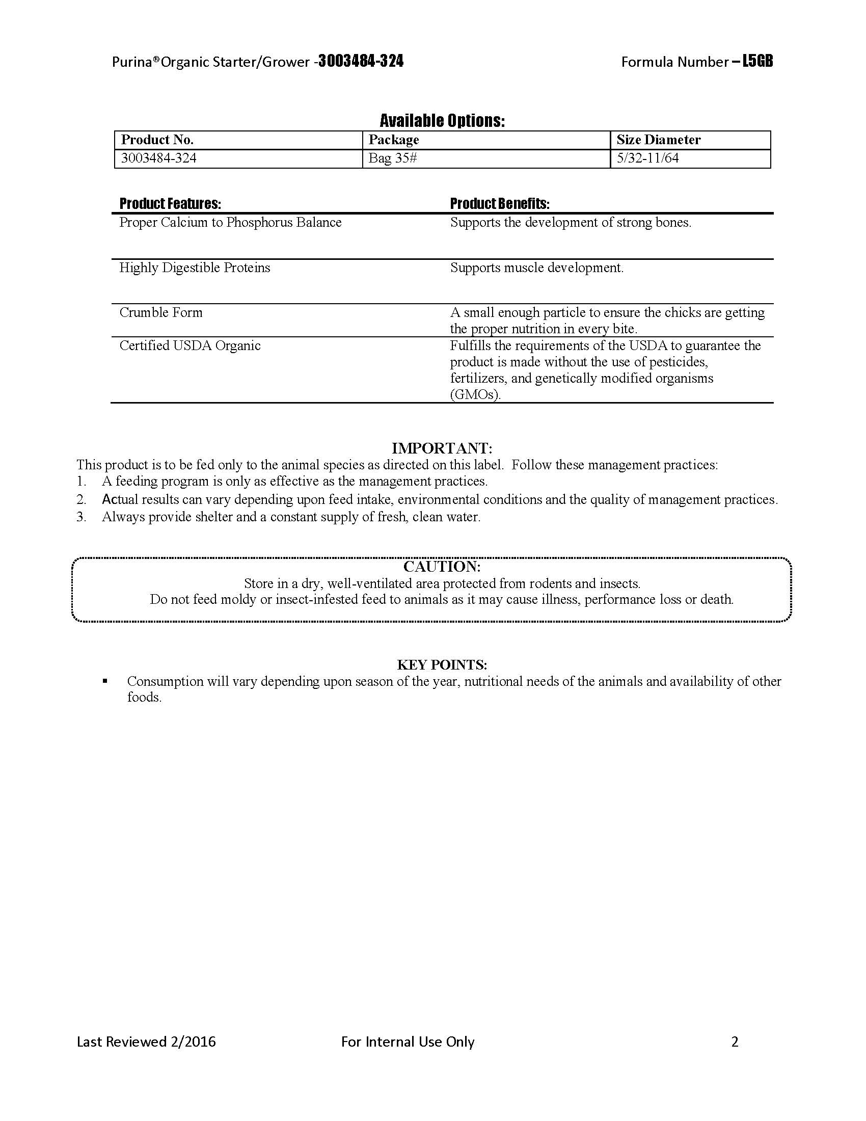 Purina® Organic Starter-Grower is a complete feed for young laying chickens from hatch to laying age and certified organic by the USDA.