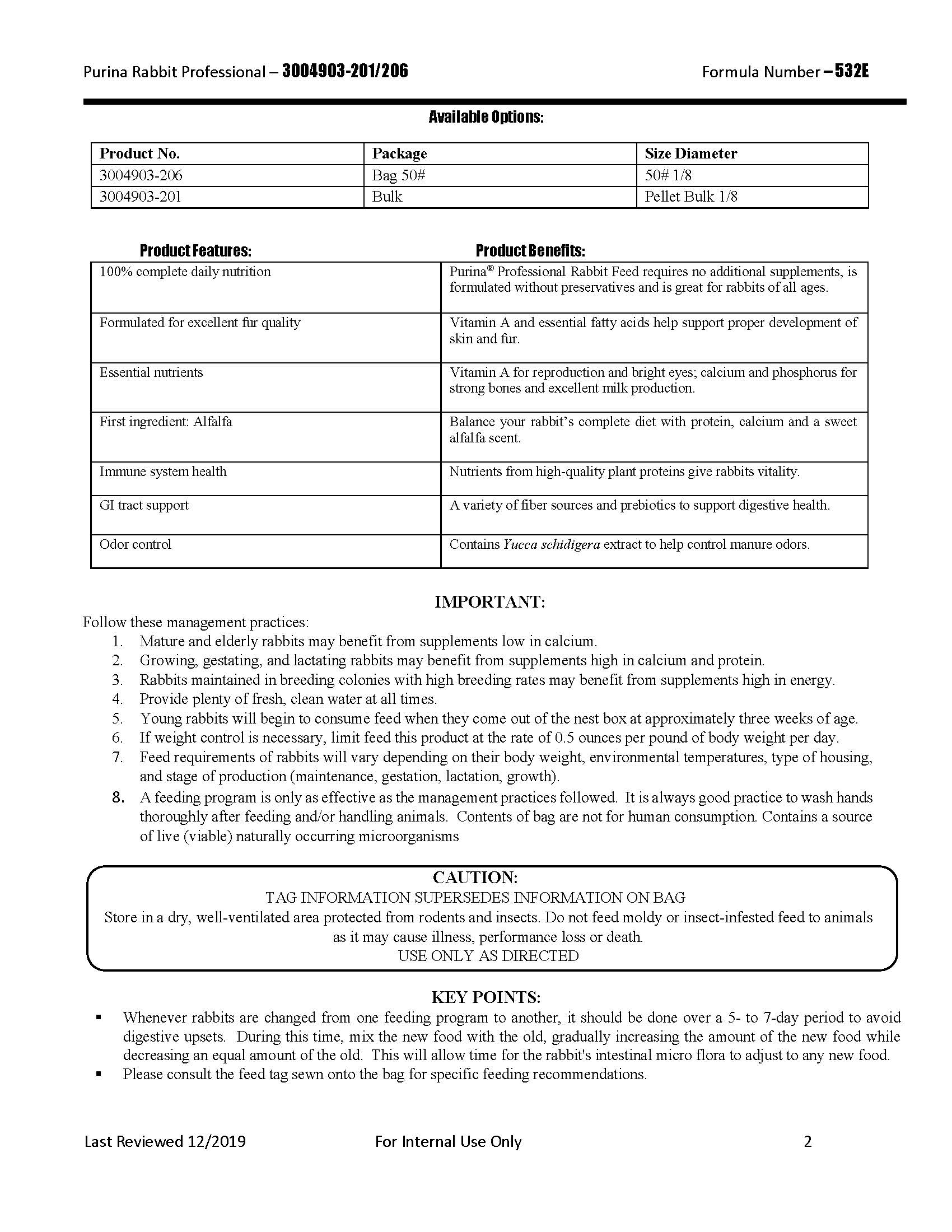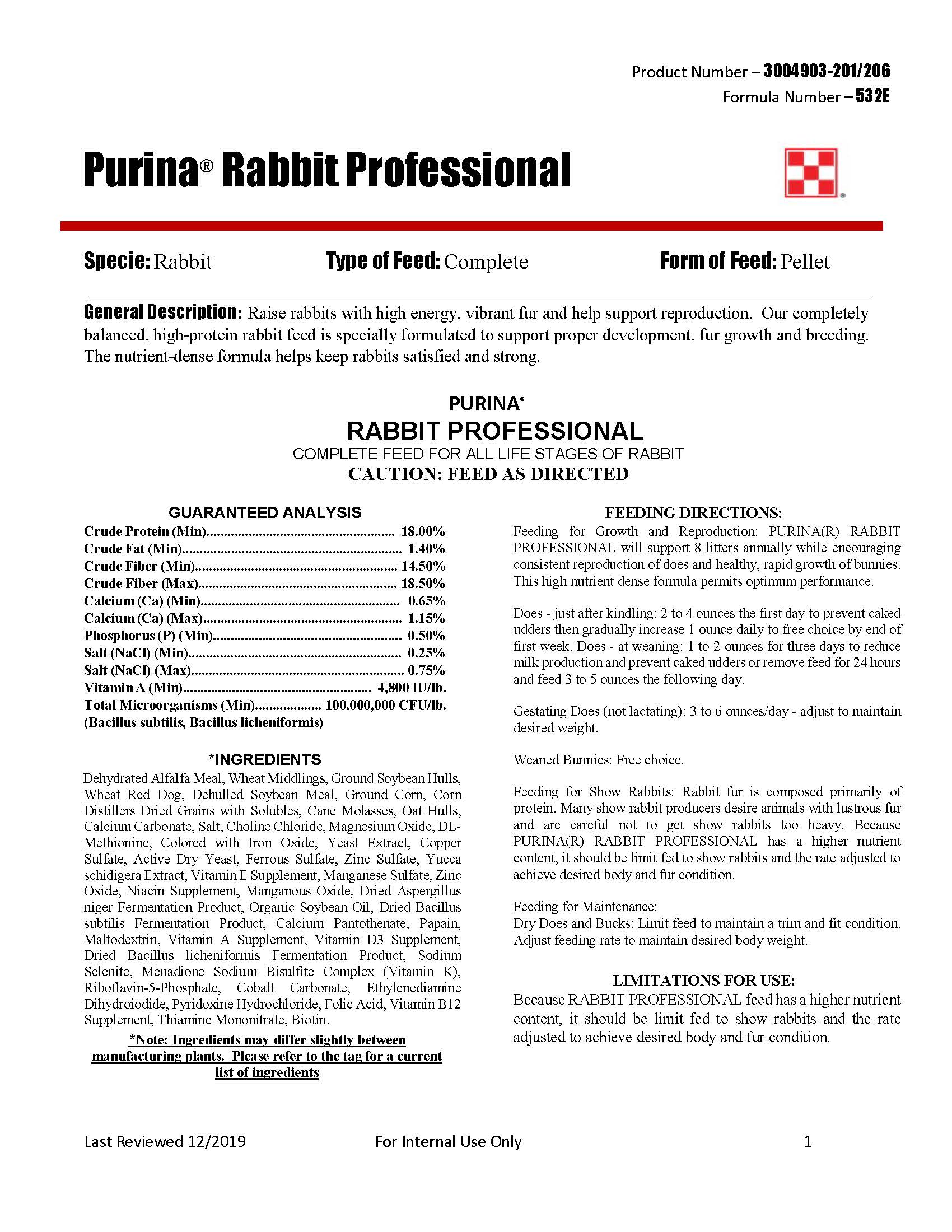 Purina® Professional Rabbit Feed is a completely balanced, high-protein rabbit food, specially formulated to support proper development, growth and breeding.